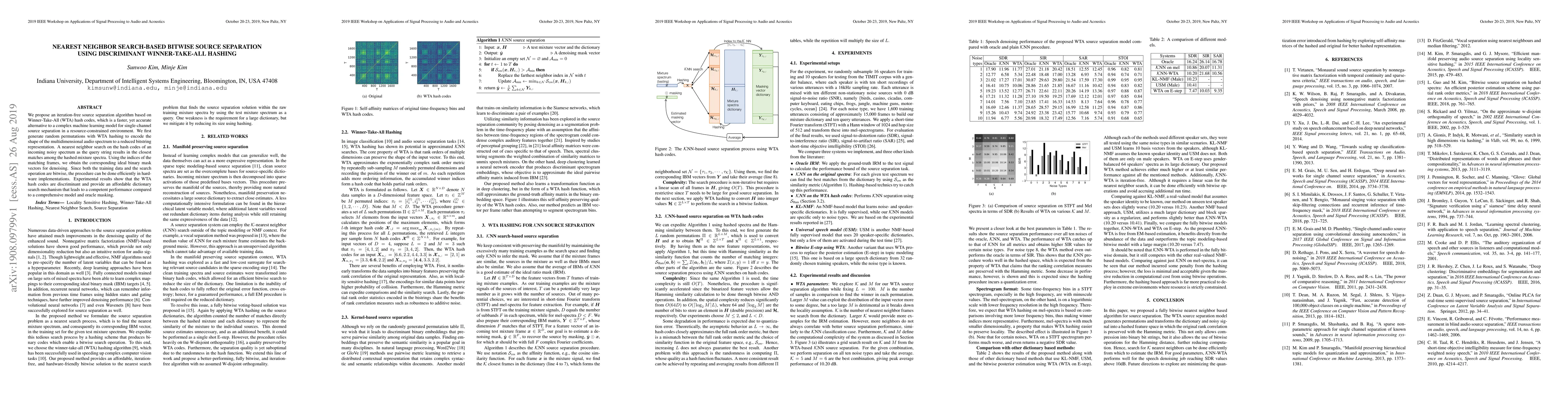 This paper introduces an efficient, iteration-free source separation algorithm using Winner-Take-All (WTA) hash codes for single-channel audio separation. The method encodes audio spectrum shapes into bitstring representations and employs nearest neighbor search for fast, accurate separation, demonstrating competitive performance compared to complex models.