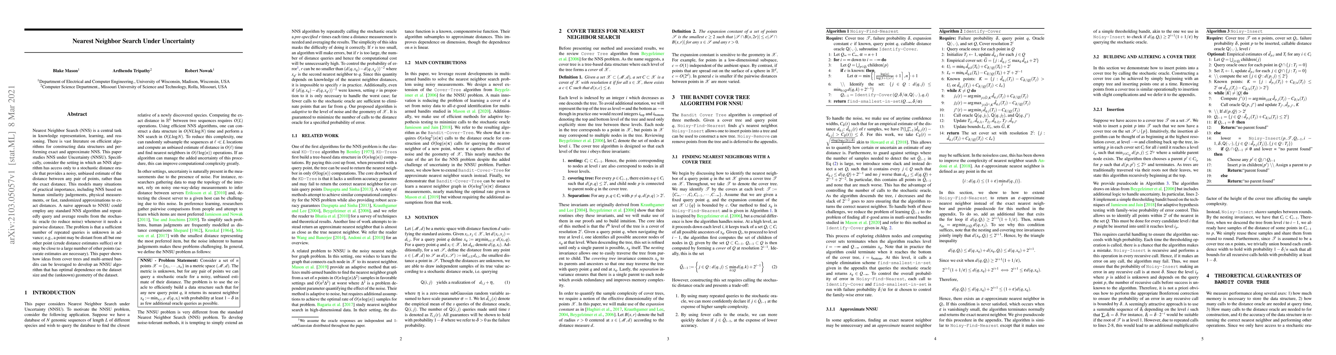 This paper explores Nearest Neighbor Search (NNS) under Uncertainty (NNSU), focusing on scenarios where distance estimates are noisy and uncertain. It proposes an efficient algorithm combining cover trees and multi-armed bandit strategies to handle the unknown geometry of the dataset, optimizing performance based on dataset size and distance uncertainty.