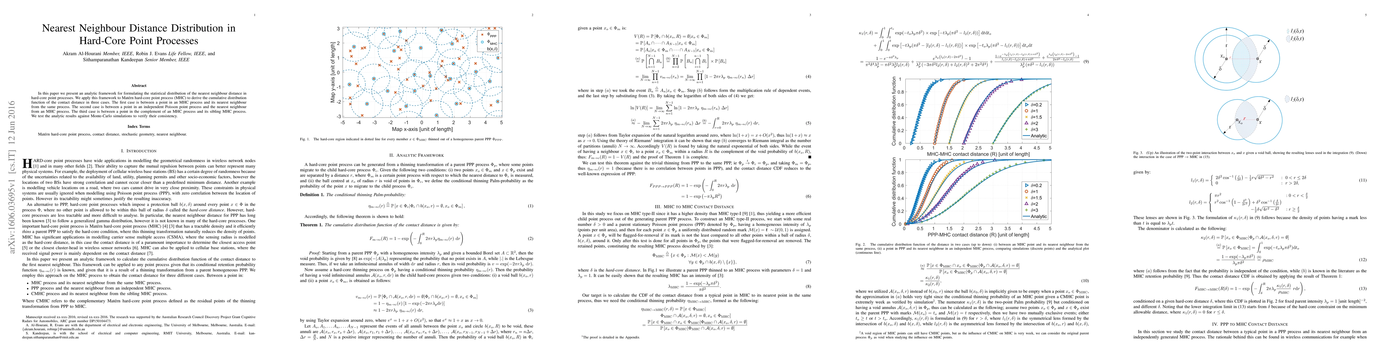 This paper develops an analytic framework for determining the nearest neighbour distance distribution in hard-core point processes, specifically applying it to the Matérn hard-core point process (MHC) to derive the cumulative distribution function for three distinct cases. The results are validated through Monte-Carlo simulations.