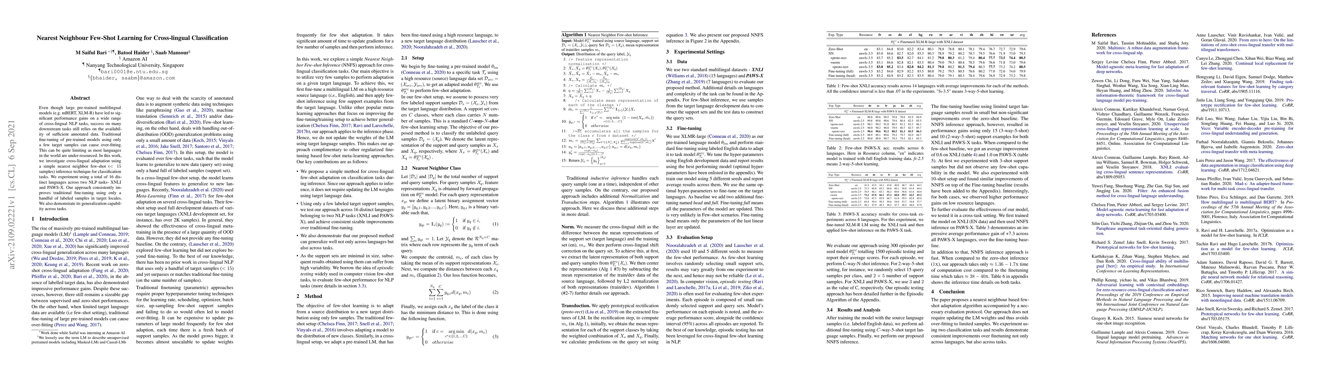 Even though large pre-trained multilingual models (e.g. mBERT, XLM-R) have led to significant performance gains on a wide range of cross-lingual NLP tasks, success on many downstream tasks still relies on the availability of sufficient annotated data. Traditional fine-tuning of pre-trained models using only a few target samples can cause over-fitting. This can be quite limiting as most languages in the world are under-resourced. In this work, we investigate cross-lingual adaptation using a simple nearest neighbor few-shot (<15 samples) inference technique for classification tasks. We experiment using a total of 16 distinct languages across two NLP tasks- XNLI and PAWS-X. Our approach consistently improves traditional fine-tuning using only a handful of labeled samples in target locales. We also demonstrate its generalization capability across tasks.