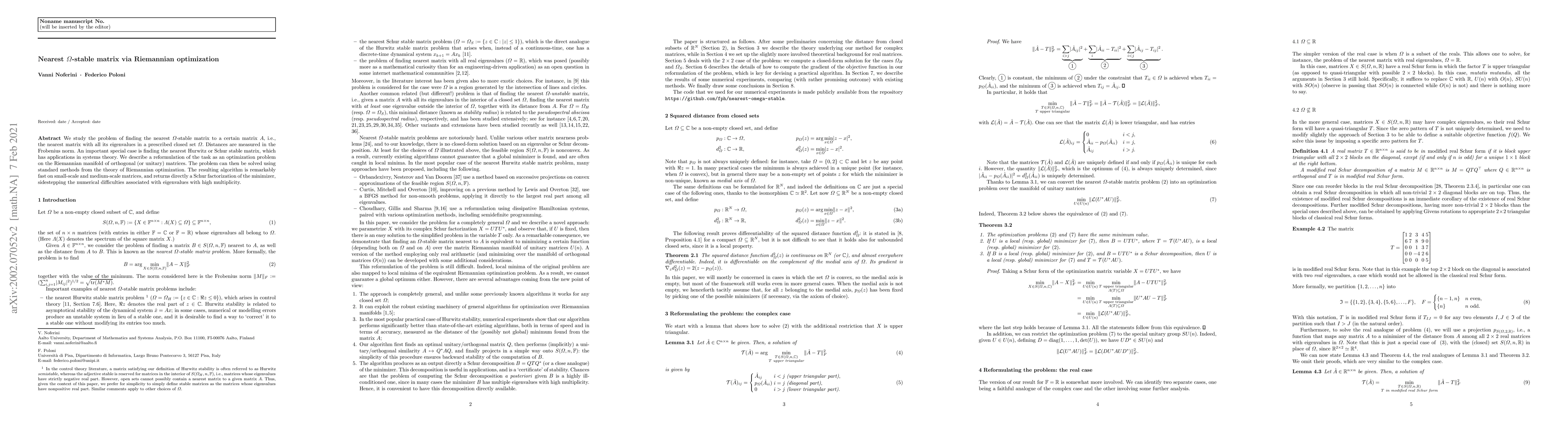 This paper explores finding the nearest $\Omega$-stable matrix to a given matrix $A$ using Riemannian optimization on the manifold of orthogonal matrices. The method is efficient for small-to-medium scale matrices and provides a Schur factorization directly, avoiding complications from eigenvalue multiplicity.