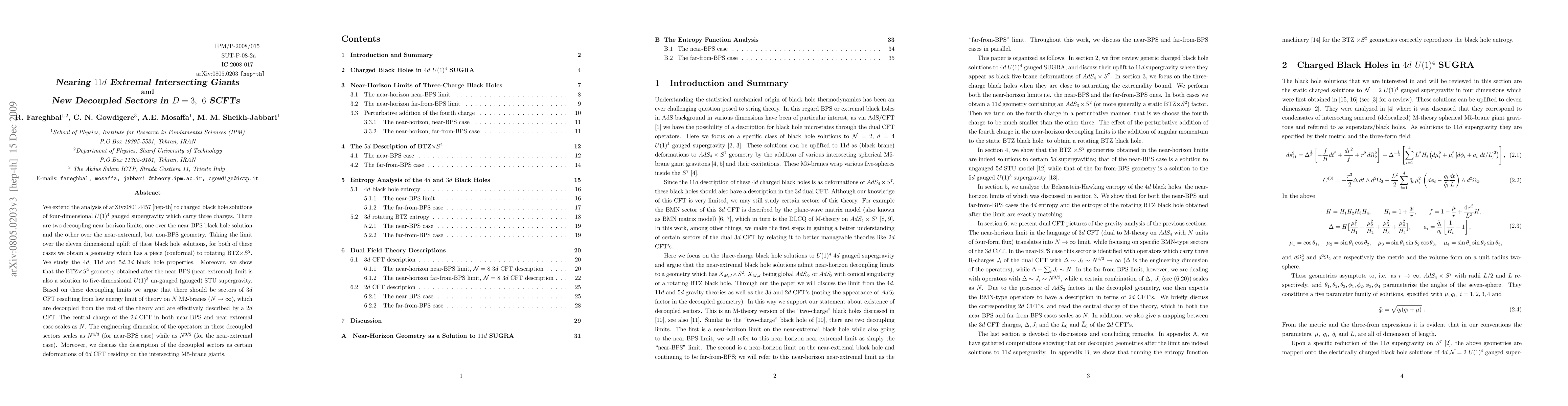 We extend the analysis of arXiv:0801.4457 [hep-th] to charged black hole solutions of four-dimensional $U(1)^4$ gauged supergravity which carry three charges. There are two decoupling near-horizon limits, one over the near-BPS black hole solution and the other over the near-extremal, but non-BPS geometry. Taking the limit over the eleven dimensional uplift of these black hole solutions, for both of these cases we obtain a geometry which has a piece (conformal) to rotating BTZ $\times S^2$. We study the 4d, $11d$ and $5d, 3d$ black hole properties. Moreover, we show that the BTZ$\times S^2$ geometry obtained after the near-BPS (near-extremal) limit is also a solution to five-dimensional $U(1)^3$ un-gauged (gauged) STU supergravity. Based on these decoupling limits we argue that there should be sectors of 3d CFT resulting from low energy limit of theory on $N$ M2-branes ($N\to \infty)$, which are decoupled from the rest of the theory and are effectively described by a 2d CFT. The central charge of the 2d CFT in both near-BPS and near-extremal case scales as $N$. The engineering dimension of the operators in these decoupled sectors scales as $N^{4/3}$ (for near-BPS case) while as $N^{3/2}$ (for the near-extremal case). Moreover, we discuss the description of the decoupled sectors as certain deformations of $6d$ CFT residing on the intersecting M5-brane giants.