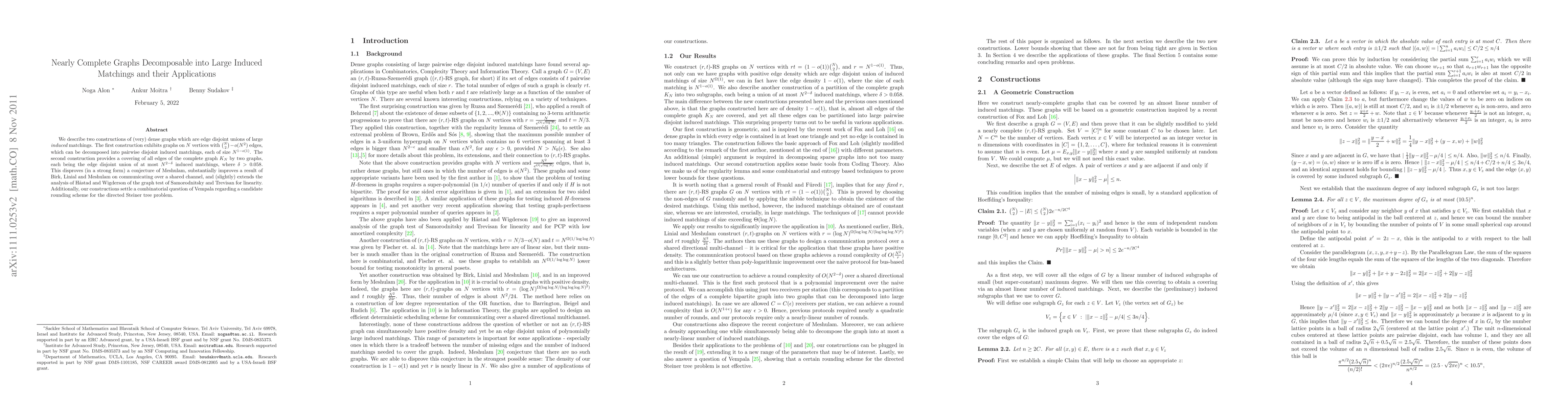 We describe two constructions of (very) dense graphs which are edge disjoint unions of large {\em induced} matchings. The first construction exhibits graphs on $N$ vertices with ${N \choose 2}-o(N^2)$ edges, which can be decomposed into pairwise disjoint induced matchings, each of size $N^{1-o(1)}$. The second construction provides a covering of all edges of the complete graph $K_N$ by two graphs, each being the edge disjoint union of at most $N^{2-\delta}$ induced matchings, where $\delta > 0.058$. This disproves (in a strong form) a conjecture of Meshulam, substantially improves a result of Birk, Linial and Meshulam on communicating over a shared channel, and (slightly) extends the analysis of H{\aa}stad and Wigderson of the graph test of Samorodnitsky and Trevisan for linearity. Additionally, our constructions settle a combinatorial question of Vempala regarding a candidate rounding scheme for the directed Steiner tree problem.