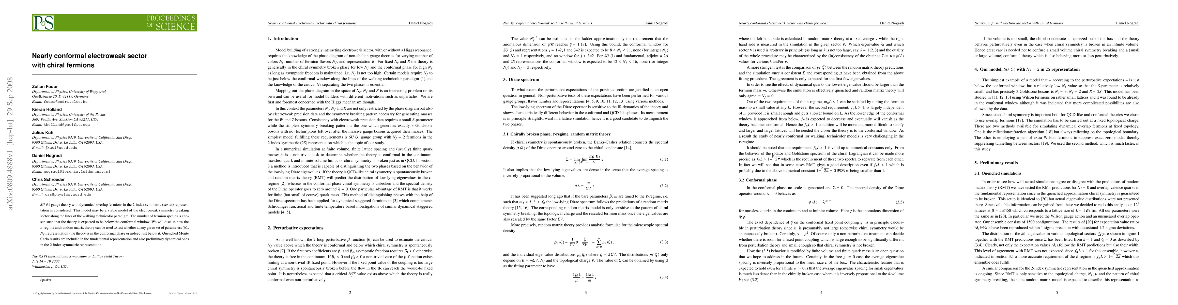 This paper explores an SU(3) gauge theory with dynamical overlap fermions in the sextet representation as a potential model for electroweak symmetry breaking, akin to walking technicolor. The study investigates whether the theory resides in the conformal phase or just below it using the epsilon-regime and random matrix theory, supplemented by quenched Monte Carlo results and preliminary dynamical simulations.