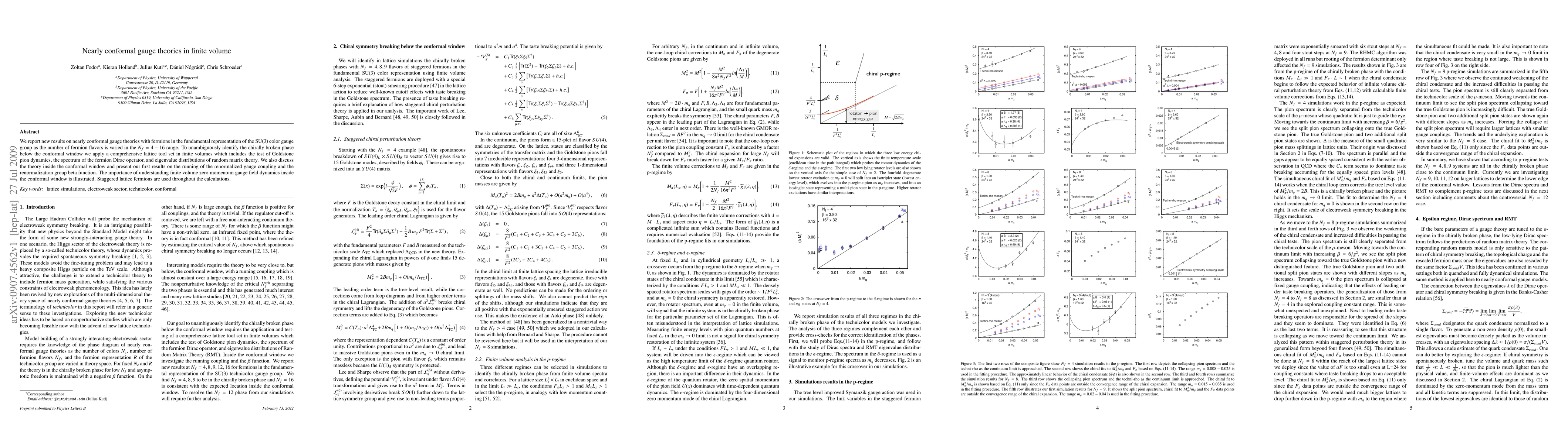 We report new results on nearly conformal gauge theories with fermions in the fundamental representation of the SU(3) color gauge group as the number of fermion flavors is varied in the Nf = 4-16 range. To unambiguously identify the chirally broken phase below the conformal window we apply a comprehensive lattice tool set in finite volumes which includes the test of Goldstone pion dynamics, the spectrum of the fermion Dirac operator, and eigenvalue distributions of random matrix theory. We also discuss the theory inside the conformal window and present our first results on the running of the renormalized gauge coupling and the renormalization group beta function. The importance of understanding finite volume zero momentum gauge field dynamics inside the conformal window is illustrated. Staggered lattice fermions are used throughout the calculations.