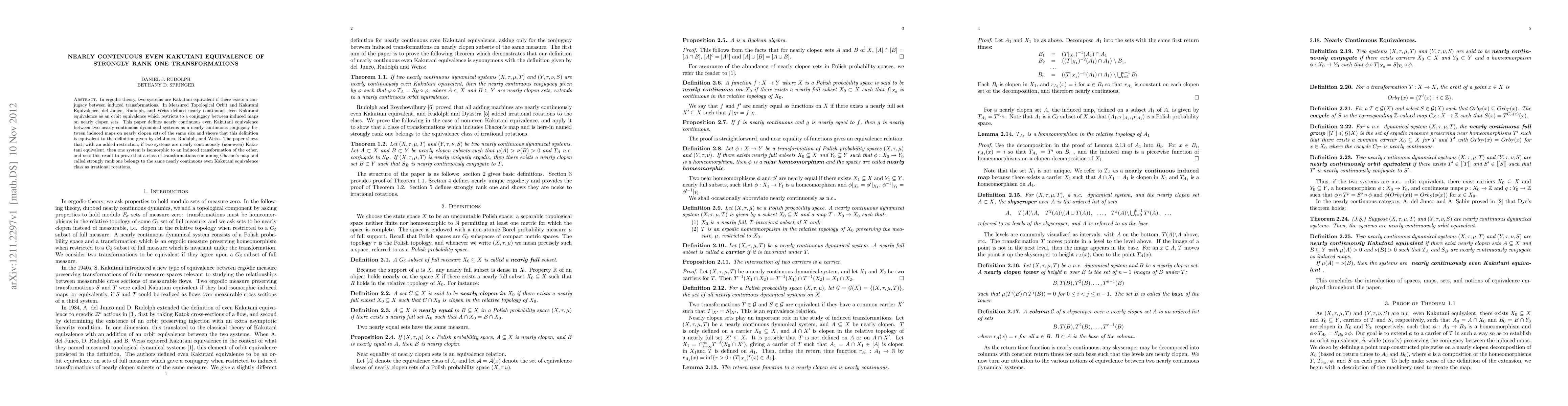 In ergodic theory, two systems are Kakutani equivalent if there exists a conjugacy between induced transformations. In Measured Topological Orbit and Kakutani Equivalence, del Junco, Rudolph, and Weiss defined nearly continuous even Kakutani equivalence as an orbit equivalence which restricts to a conjugacy between induced maps on nearly clopen sets. This paper defines nearly continuous even Kakutani equivalence between two nearly continuous dynamical systems as a nearly continuous conjugacy between induced maps on nearly clopen sets of the same size and shows that this definition is equivalent to the definition given by del Junco, Rudolph, and Weiss. The paper shows that, with an added restriction, if two systems are nearly continuously (non-even) Kakutani equivalent, then one system is isomorphic to an induced transformation of the other, and uses this result to prove that a class of transformations called strongly rank one and containing Chacon's map belongs to the same nearly continuous even Kakutani equivalence class as irrational rotations.