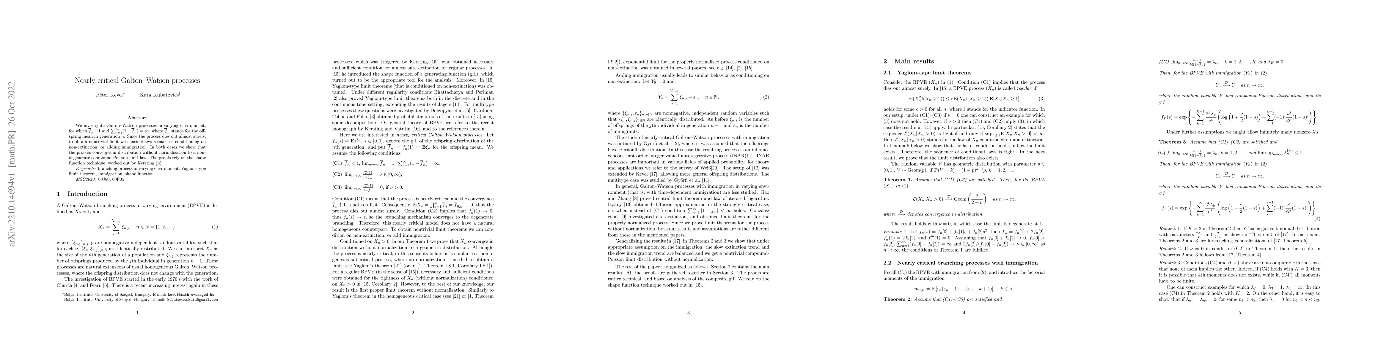 This paper studies Galton-Watson processes with nearly critical offspring means, where extinction is almost certain. It explores convergence in distribution to a compound-Poisson limit under non-extinction conditioning or immigration, using Kersting's shape function technique.