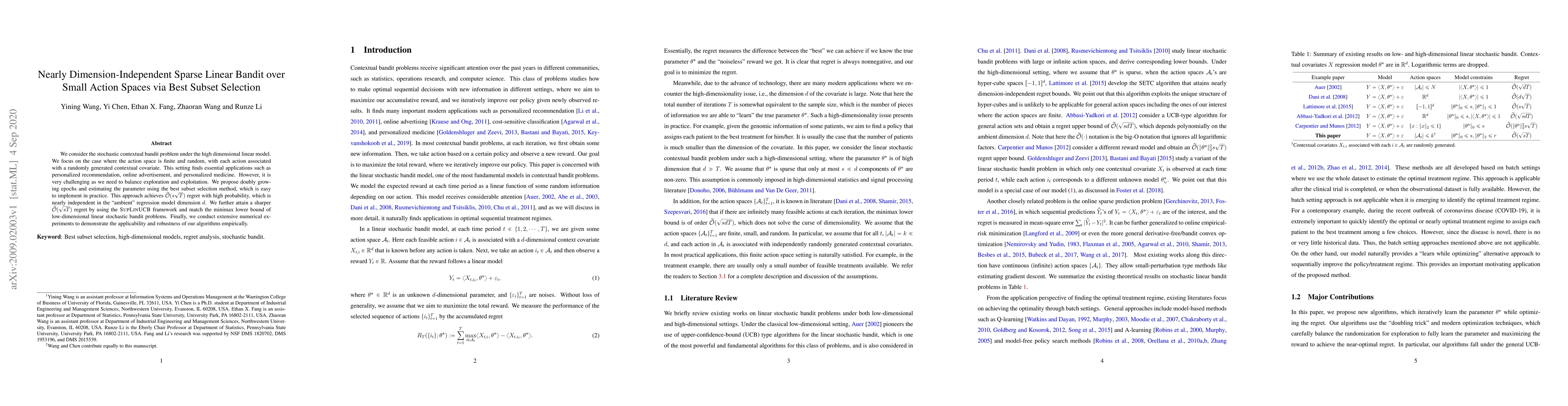 We consider the stochastic contextual bandit problem under the high dimensional linear model. We focus on the case where the action space is finite and random, with each action associated with a randomly generated contextual covariate. This setting finds essential applications such as personalized recommendation, online advertisement, and personalized medicine. However, it is very challenging as we need to balance exploration and exploitation. We propose doubly growing epochs and estimating the parameter using the best subset selection method, which is easy to implement in practice. This approach achieves $ \tilde{\mathcal{O}}(s\sqrt{T})$ regret with high probability, which is nearly independent in the ``ambient'' regression model dimension $d$. We further attain a sharper $\tilde{\mathcal{O}}(\sqrt{sT})$ regret by using the \textsc{SupLinUCB} framework and match the minimax lower bound of low-dimensional linear stochastic bandit problems. Finally, we conduct extensive numerical experiments to demonstrate the applicability and robustness of our algorithms empirically.