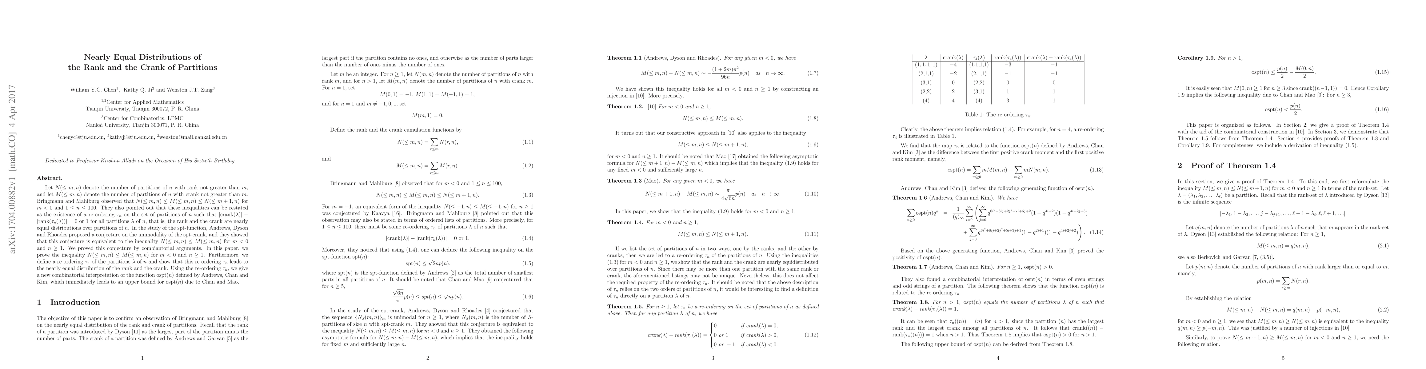 This paper proves the inequality $N(\leq m,n)\leq M(\leq m,n)$ for $m<0$ and $n\geq 1$, establishing nearly equal distributions of the rank and the crank in partitions of $n$. It introduces a re-ordering $\tau_n$ that achieves this near-equality and provides a new combinatorial interpretation for the function ospt$(n)$.