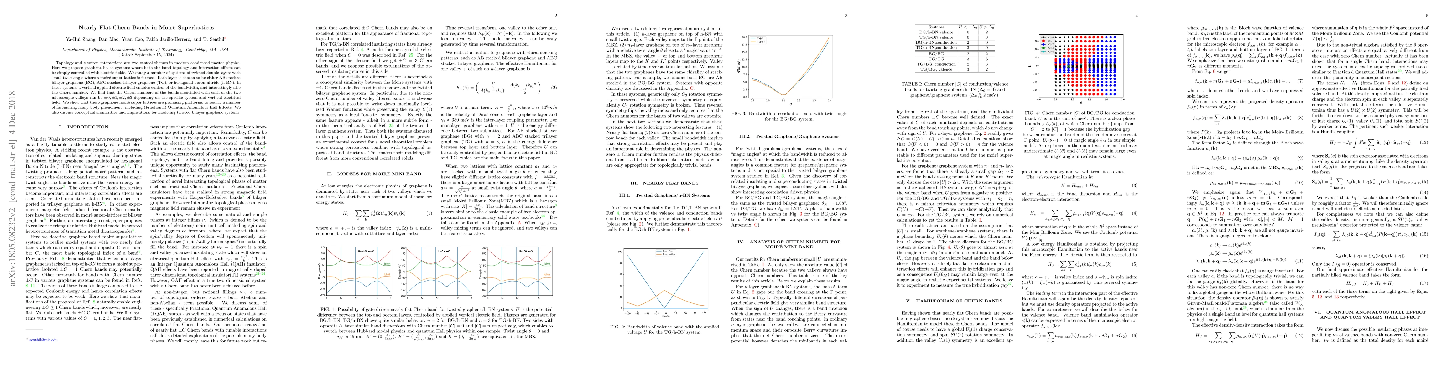 This paper explores graphene-based moiré superlattices where both band topology and electron interactions are controlled by electric fields, revealing nearly flat Chern bands and the potential for fractional quantum anomalous Hall effects. The study highlights the tunability of Chern numbers and the implications for many-body phenomena in these systems.