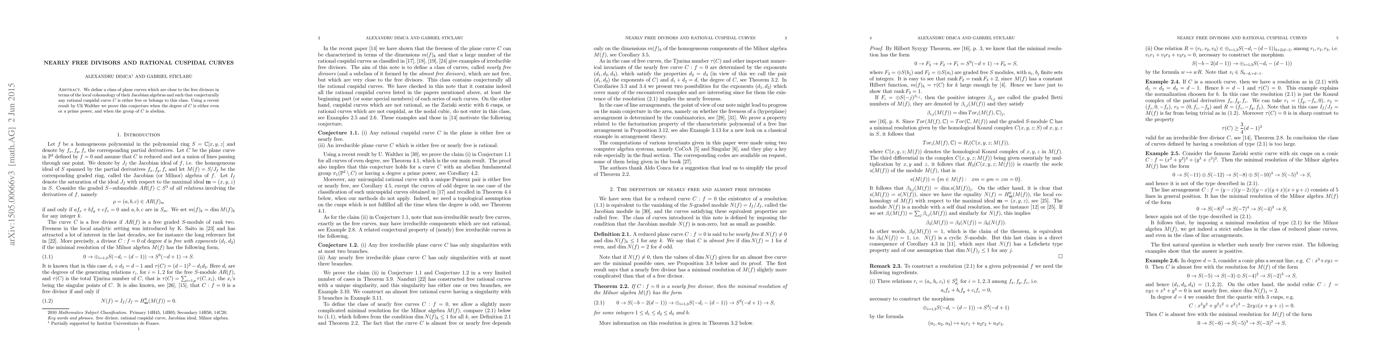This paper introduces nearly free divisors, a class of plane curves close to free divisors, and conjectures that it includes rational cuspidal curves. It leverages a result by Walther to demonstrate that any unicuspidal rational curve with a single Puiseux pair is either free or falls within this new class.