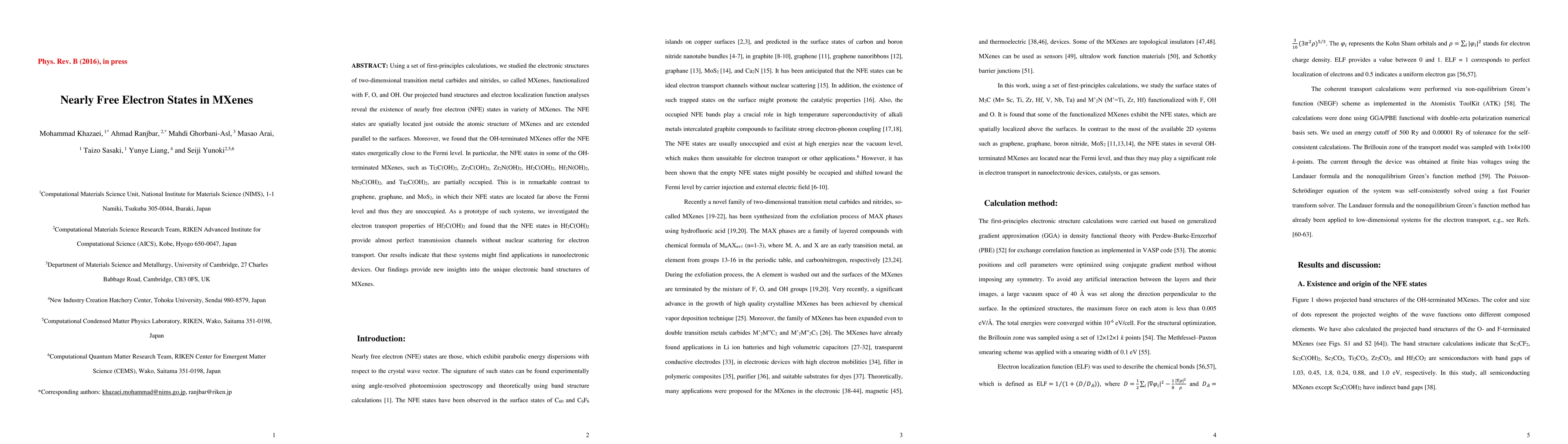 This paper reports on first-principles calculations revealing the existence of nearly free electron states in various functionalized MXenes, particularly OH-terminated MXenes, which exhibit these states close to the Fermi level and partially occupied. The study suggests these materials could serve as efficient electron transport channels, indicating potential applications in nanoelectronic devices.