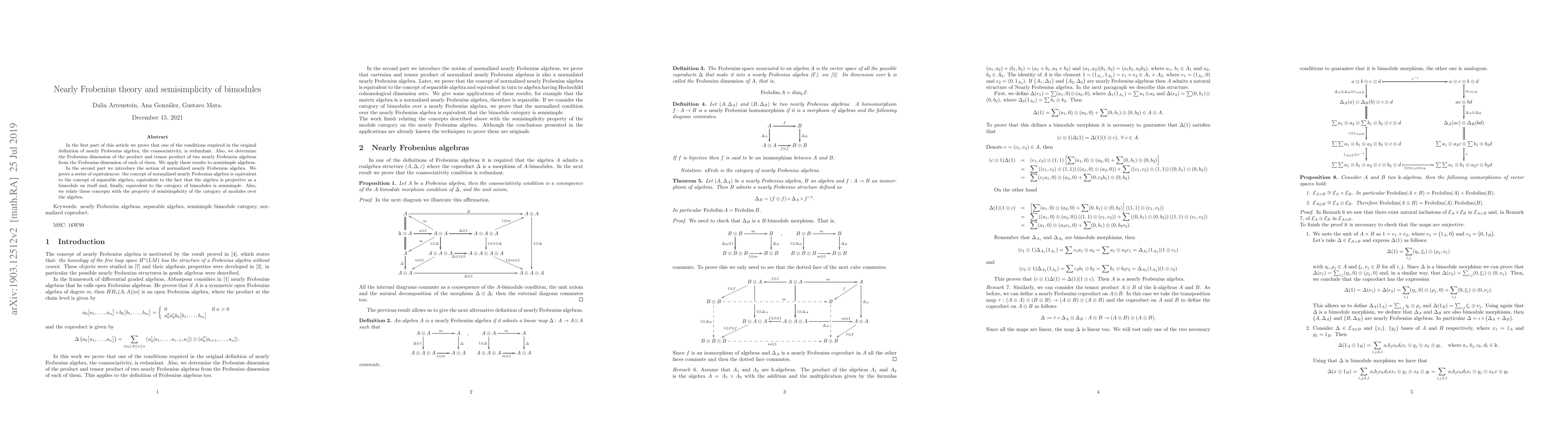 This paper proves that coassociativity is unnecessary in the definition of nearly Frobenius algebra and derives the Frobenius dimension for products and tensors of nearly Frobenius algebras. It then establishes equivalences between normalized nearly Frobenius algebras, separable algebras, and semisimplicity of the category of bimodules, linking these to semisimplicity in the module category.