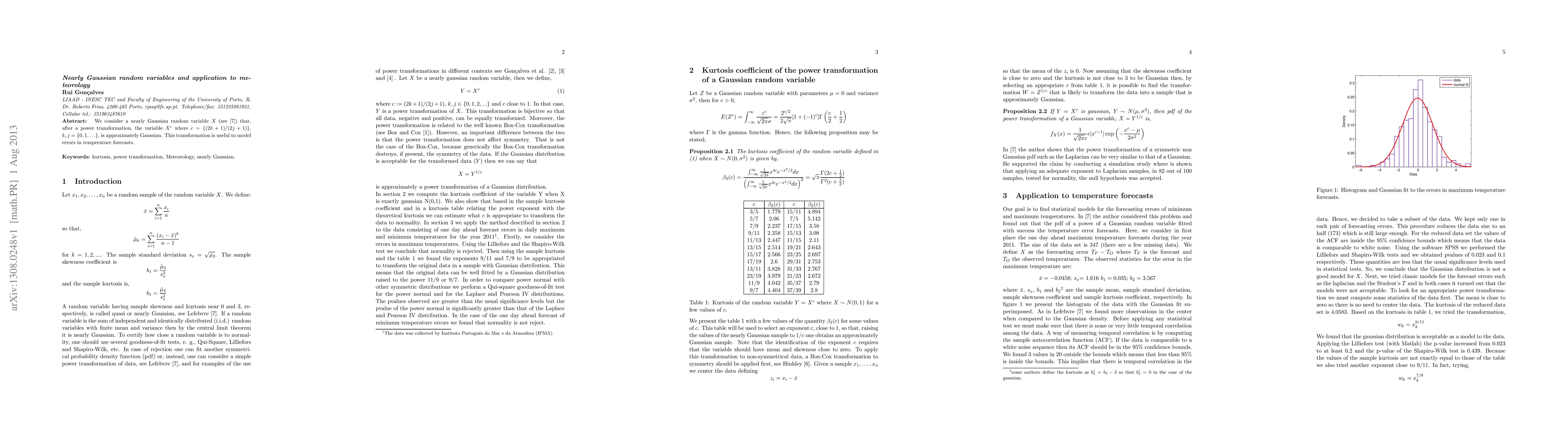 Summary: The paper explores nearly Gaussian random variables through a power transformation that approximates Gaussianity, which is applied to model errors in temperature forecasts in meteorology. This transformation enhances the accuracy of error modeling in weather predictions.
