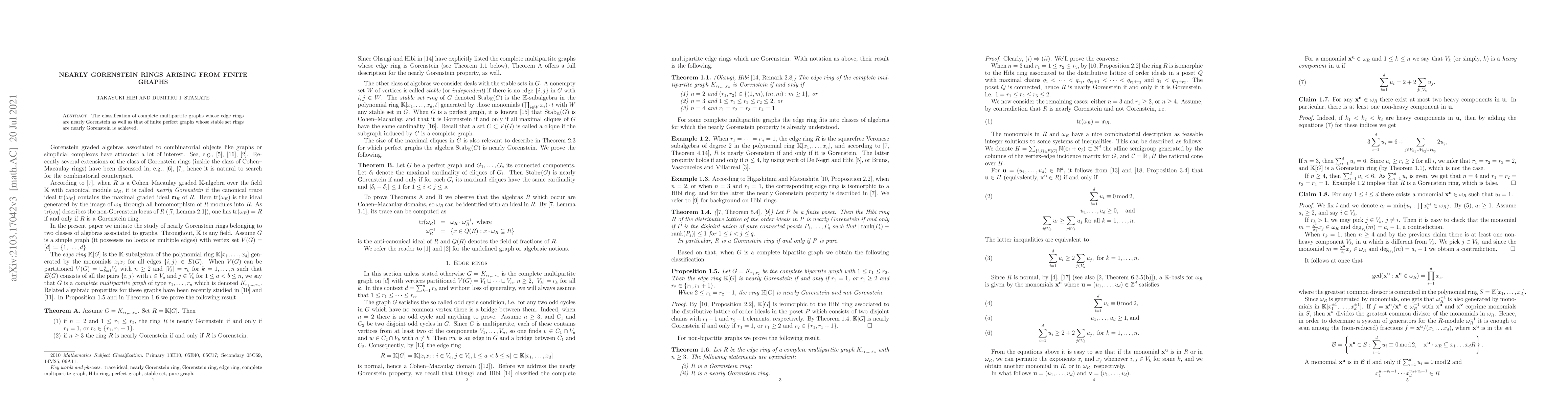 The classification of complete multipartite graphs whose edge rings are nearly Gorenstein as well as that of finite perfect graphs whose stable set rings are nearly Gorenstein is achieved.