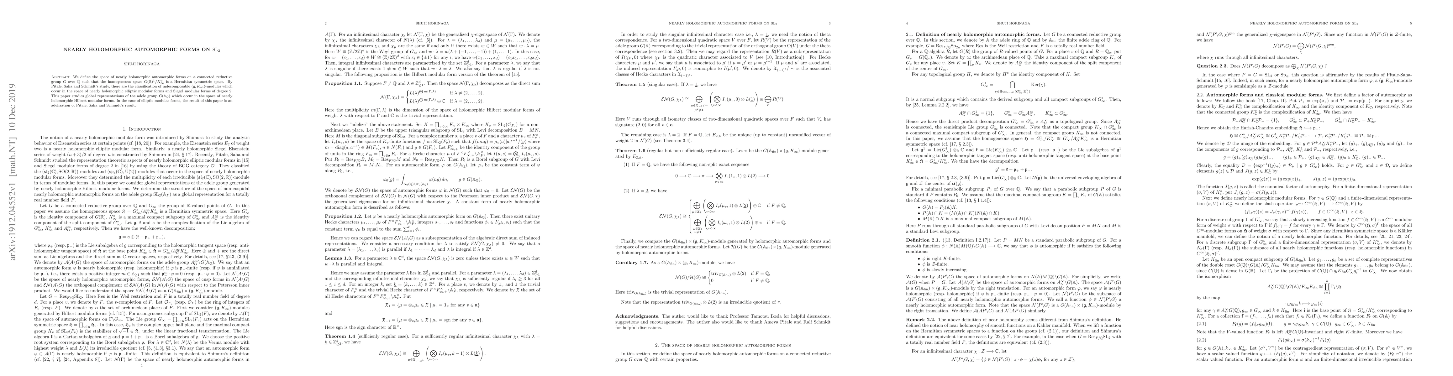 This paper defines nearly holomorphic automorphic forms on $\mathrm{SL}_2$ and classifies global representations of the adele group occurring in this space, extending previous results for elliptic and Siegel modular forms to Hilbert modular forms. The study also adelizes the classification of indecomposable $(\mathfrak{g},K_\infty)$-modules.