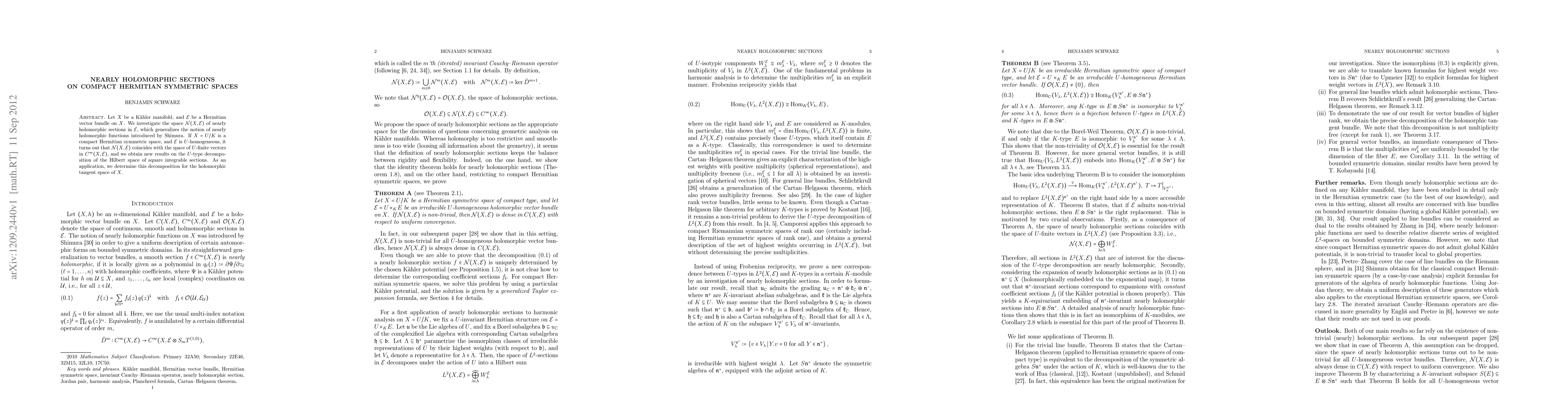 This paper explores the space of nearly holomorphic sections on compact Hermitian symmetric spaces, showing that it aligns with the space of $U$-finite vectors. It provides new insights into the $U$-type decomposition of the Hilbert space of square integrable sections, particularly for the holomorphic tangent space.