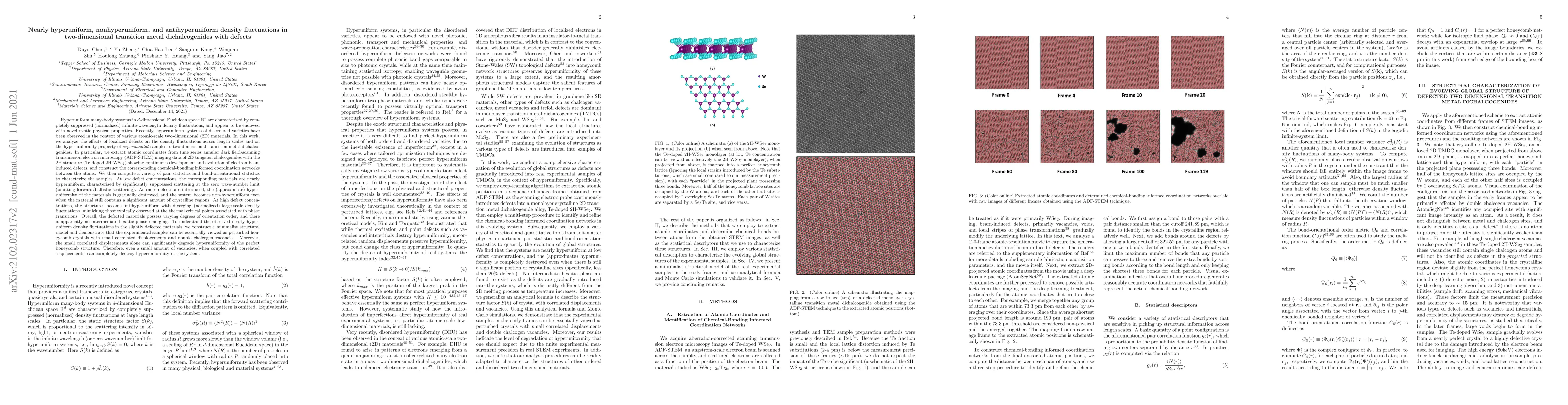 Hyperuniform many-body systems in $d$-dimensional Euclidean space are characterized by completely suppressed (normalized) infinite-wavelength density fluctuations, and appear to be endowed with novel exotic physical properties. In this work, we analyze the effects of localized defects on the density fluctuations across length scales and on the hyperuniformity property of experimental samples of two-dimensional transition metal dichalcogenides. In particular, we extract atomic coordinates from time series annular dark field-scanning transmission electron microscopy imaging data of 2D tungsten chalcogenides with the 2H structure showing continuous development and evolution of electron-beam induced defects, and construct the corresponding chemical-bonding informed coordination networks between the atoms. We then compute a variety of pair statistics and bond-orientational statistics to characterize the samples. At low defect concentrations, the corresponding materials are nearly hyperuniform. As more defects are introduced, the (approximate) hyperuniformity of the materials is gradually destroyed, and the system becomes non-hyperuniform even when the material still contains a significant amount of crystalline regions. At high defect concentrations, the structures become antihyperuniform with diverging (normalized) large-scale density fluctuations. Overall, the defected materials possess varying degrees of orientation order, and there is apparently no intermediate hexatic phase emerging. We also construct a minimalist structural model and demonstrate that the experimental samples can be essentially viewed as perturbed honeycomb crystals with small correlated displacements and double chalcogen vacancies.