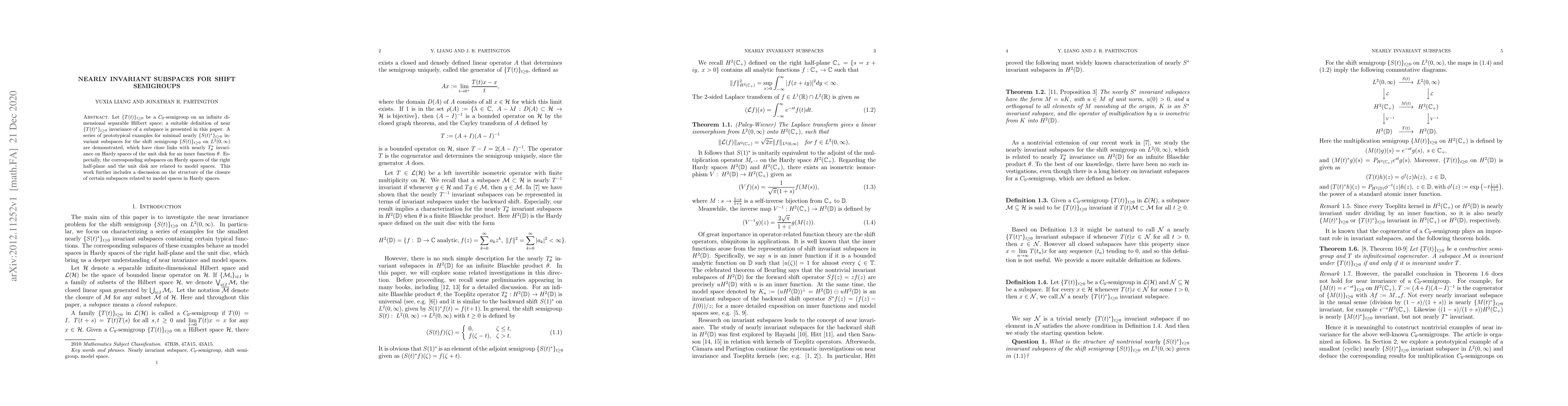 Let $\{T(t)\}_{t\geq0}$ be a $C_0$-semigroup on an infinite dimensional separable Hilbert space; a suitable definition of near $\{T(t)^*\}_{t\geq0}$ invariance of a subspace is presented in this paper. A series of prototypical examples for minimal nearly $\{S(t)^*\}_{t\geq0}$ invariant subspaces for the shift semigroup $\{S(t)\}_{t\geq0}$ on $L^2(0,\infty)$ are demonstrated, which have close links with nearly $T_{\theta}^*$ invariance on Hardy spaces of the unit disk for Toeplitz operators associated with an inner function $\theta$. Especially, the corresponding subspaces on Hardy spaces of the right half-plane and the unit disk are related to model spaces. This work further includes a discussion on the structure of the closure of certain subspaces related to model spaces in Hardy spaces.