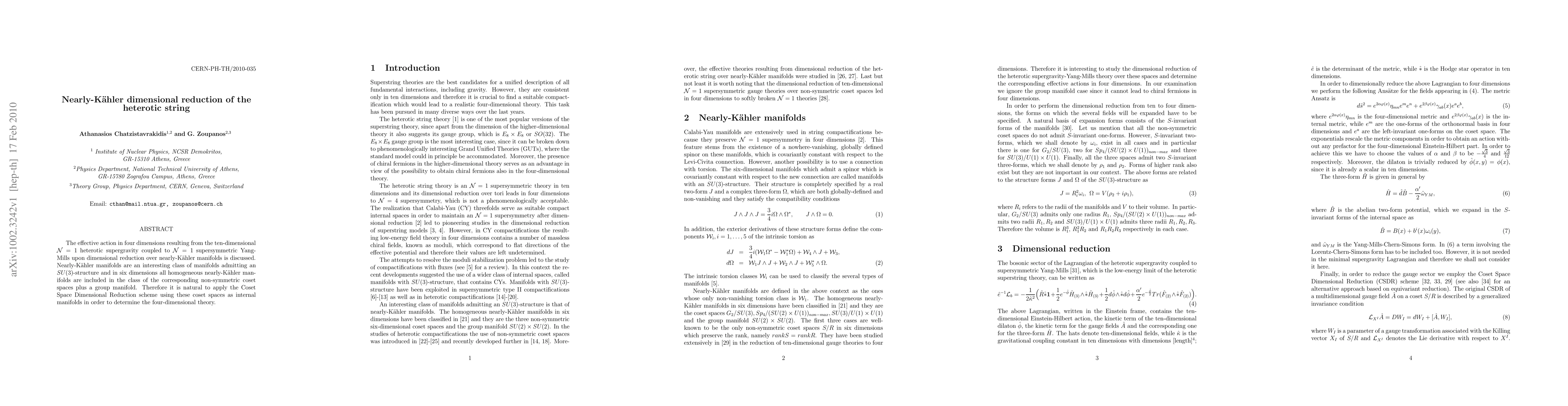 The effective action in four dimensions resulting from the ten-dimensional N=1 heterotic supergravity coupled to N=1 supersymmetric Yang-Mills upon dimensional reduction over nearly-Kaehler manifolds is discussed. Nearly-Kaehler manifolds are an interesting class of manifolds admitting an SU(3)-structure and in six dimensions all homogeneous nearly-Kaehler manifolds are included in the class of the corresponding non-symmetric coset spaces plus a group manifold. Therefore it is natural to apply the Coset Space Dimensional Reduction scheme using these coset spaces as internal manifolds in order to determine the four-dimensional theory.