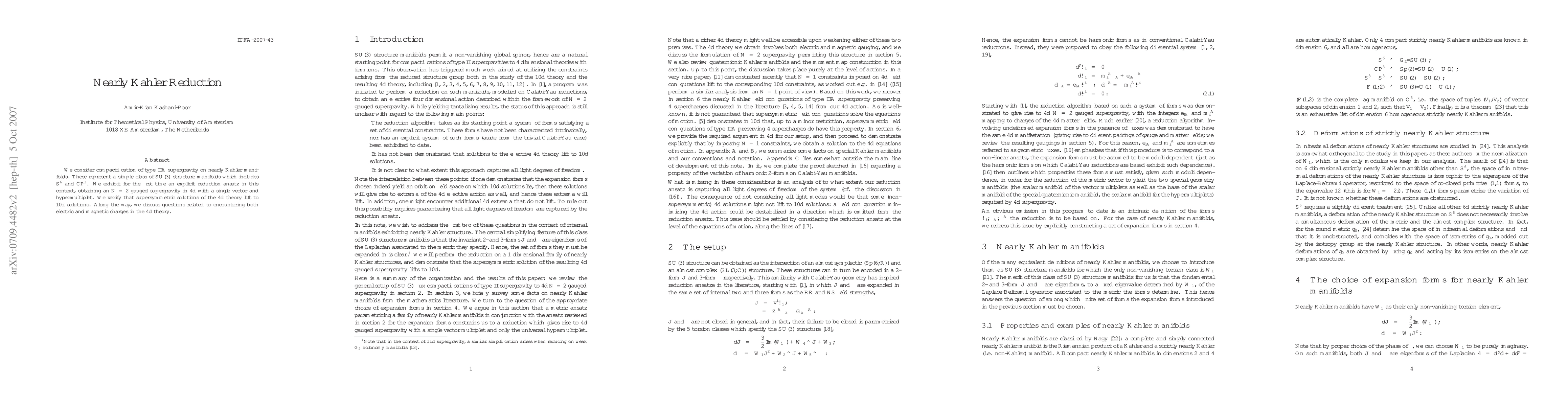 We consider compactification of type IIA supergravity on nearly Kaehler manifolds. These represent a simple class of SU(3) structure manifolds which includes S^6 and CP^3. We exhibit for the first time an explicit reduction ansatz in this context, obtaining an N=2 gauged supergravity in 4d with a single vector and hypermultiplet. We verify that supersymmetric solutions of the 4d theory lift to 10d solutions. Along the way, we discuss questions related to encountering both electric and magnetic charges in the 4d theory.