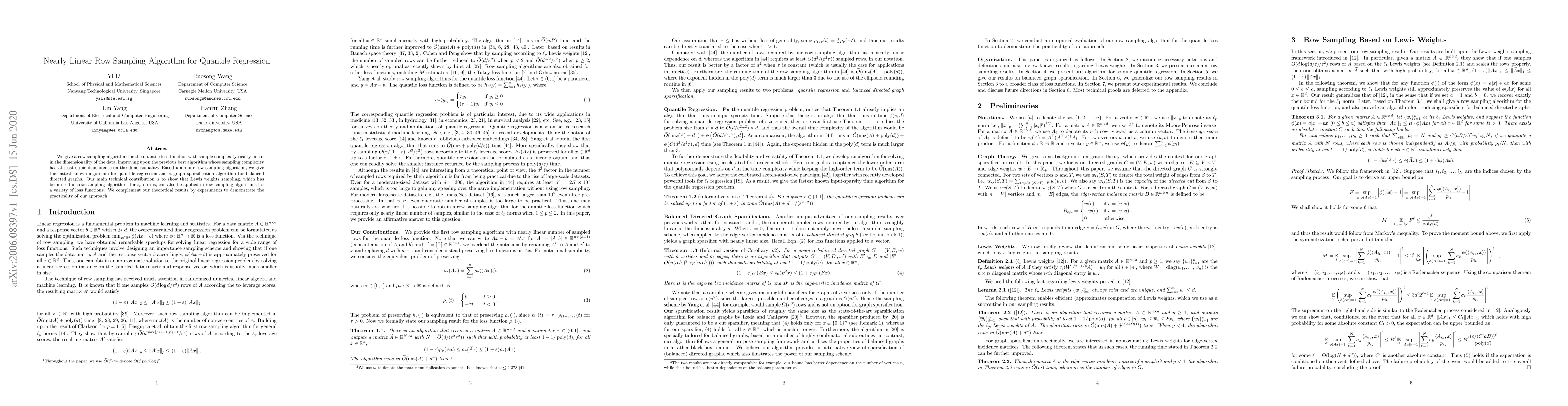 This paper presents a nearly linear row sampling algorithm for quantile regression, improving upon previous algorithms with cubic dimensionality dependence. The authors demonstrate that Lewis weights sampling can be effectively applied to a variety of loss functions, leading to the fastest known quantile regression and graph sparsification algorithms.