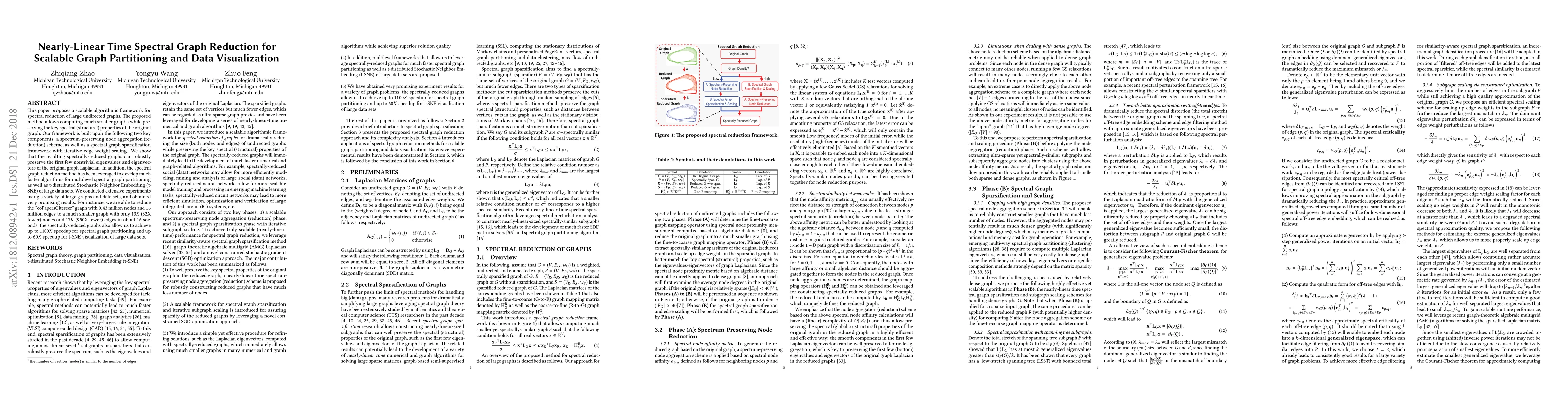 This paper introduces a scalable spectral reduction framework for large undirected graphs, preserving key structural properties through node aggregation and edge weight scaling. The method achieves significant speedups in graph partitioning and data visualization, demonstrated by reducing a large graph to a much smaller one while maintaining spectral integrity.