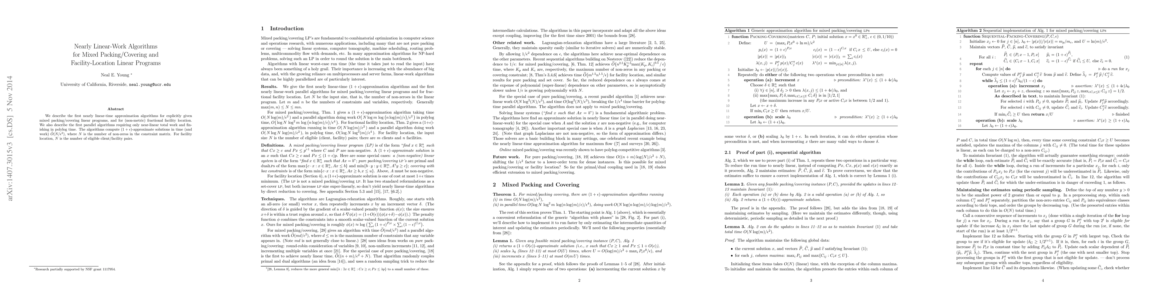 This paper presents nearly linear-time approximation algorithms for mixed packing/covering linear programs and non-metric fractional facility location, achieving $(1+\epsilon)$-approximations in $O^*(N/\epsilon^2)$ time and work, where $N$ is the number of non-zeros in the constraint matrix. It also introduces the first parallel algorithms with near-linear total work and polylogarithmic time complexity.