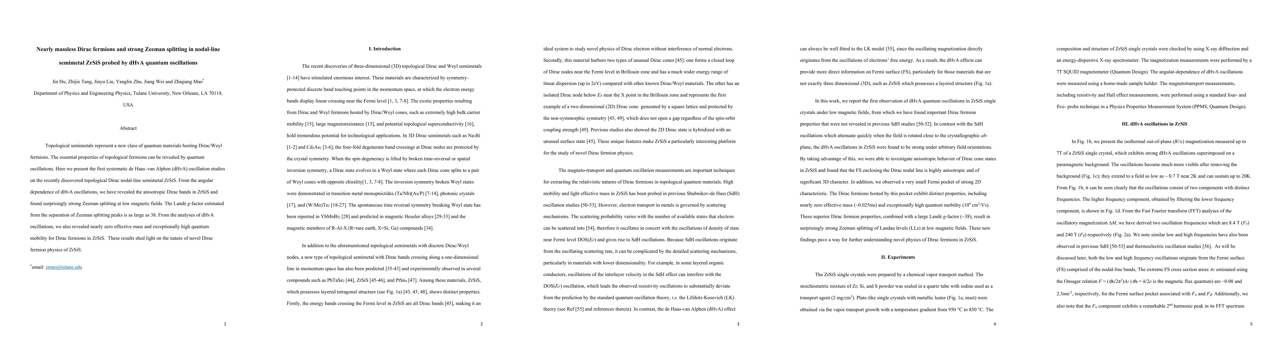 This study reveals nearly massless Dirac fermions and strong Zeeman splitting in the topological nodal-line semimetal ZrSiS through de Haas-van Alphen quantum oscillations, with a Landé g-factor as large as 38 and exceptional quantum mobility.