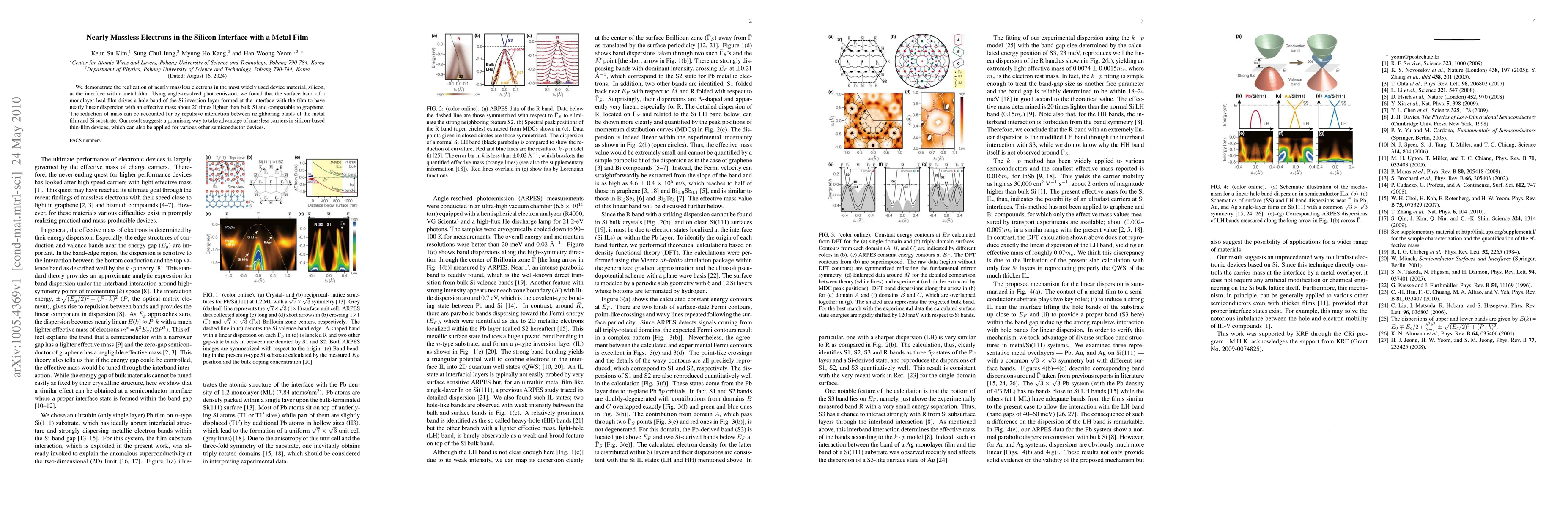 We demonstrate the realization of nearly massless electrons in the most widely used device material, silicon, at the interface with a metal film. Using angle-resolved photoemission, we found that the surface band of a monolayer lead film drives a hole band of the Si inversion layer formed at the interface with the film to have nearly linear dispersion with an effective mass about 20 times lighter than bulk Si and comparable to graphene. The reduction of mass can be accounted for by repulsive interaction between neighboring bands of the metal film and Si substrate. Our result suggests a promising way to take advantage of massless carriers in silicon-based thin-film devices, which can also be applied for various other semiconductor devices.