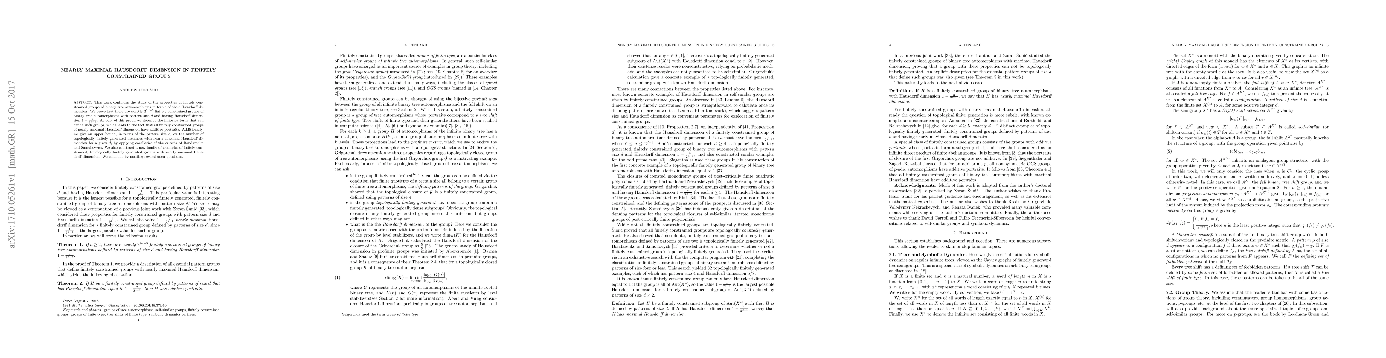 This paper investigates finitely constrained groups of binary tree automorphisms, proving that there are $2^{2d-3}$ such groups with nearly maximal Hausdorff dimension $1 - \frac{2}{2^{d-1}}$. It also establishes an upper bound for topologically finitely generated instances and introduces a new family of examples.