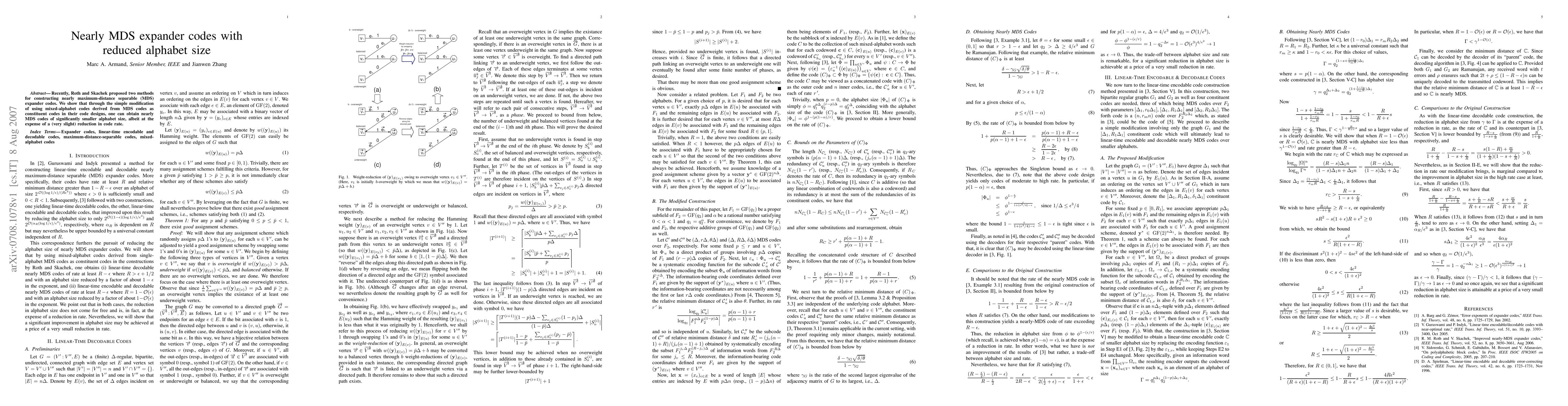 The paper proposes a method for constructing nearly MDS expander codes with reduced alphabet size by modifying existing methods using mixed-alphabet codes derived from MDS codes as constituent codes.