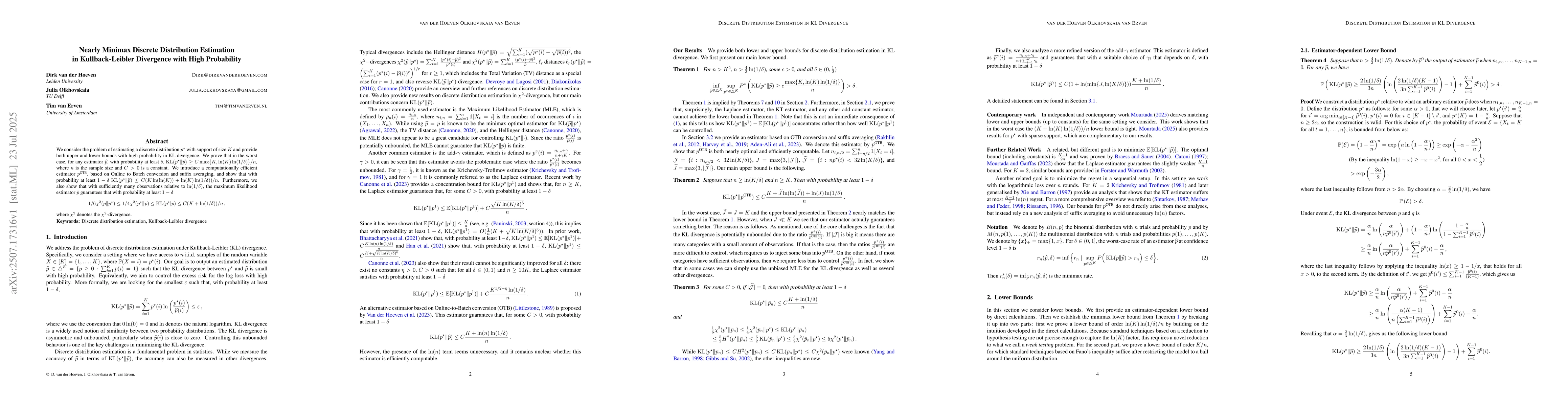The paper analyzes the problem of estimating a discrete distribution \( p \) with support size \( K \) in Kullback-Leibler (KL) divergence, providing both upper and lower bounds with high probability. It introduces an efficient estimator \( p^{\text{OTB}} \) based on Online to Batch conversion and suffix averaging, and examines the maximum likelihood estimator \( \bar{p} \).