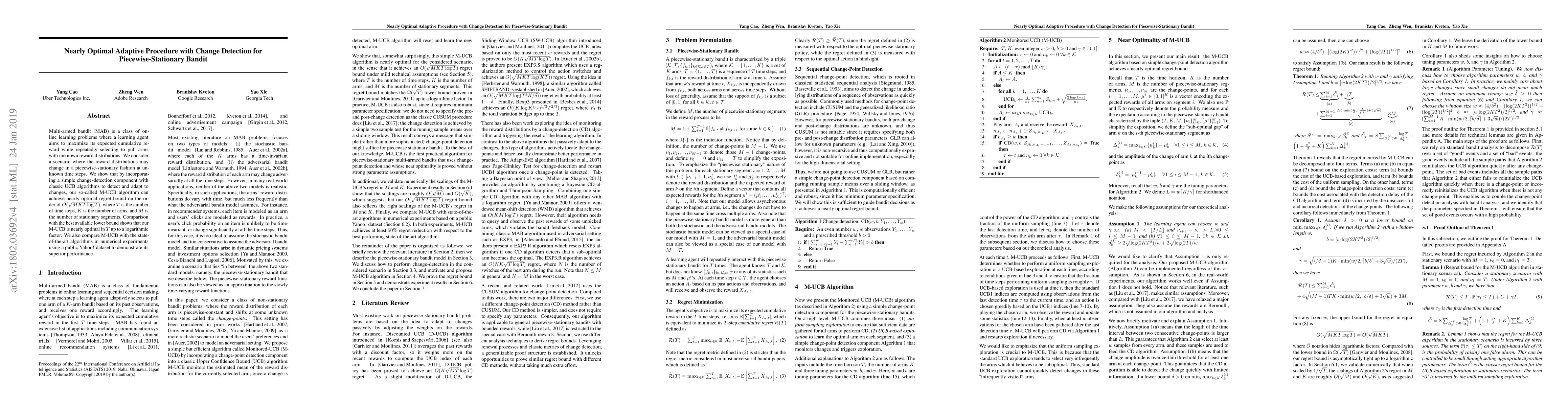 This paper proposes an adaptive M-UCB algorithm for multi-armed bandit problems with piecewise-stationary reward distributions, achieving nearly optimal regret bounds of $O(\sqrt{MKT\log T})$. The algorithm integrates a change detection component to adapt to unknown reward distribution changes, demonstrating superior performance compared to state-of-the-art methods in numerical experiments.
