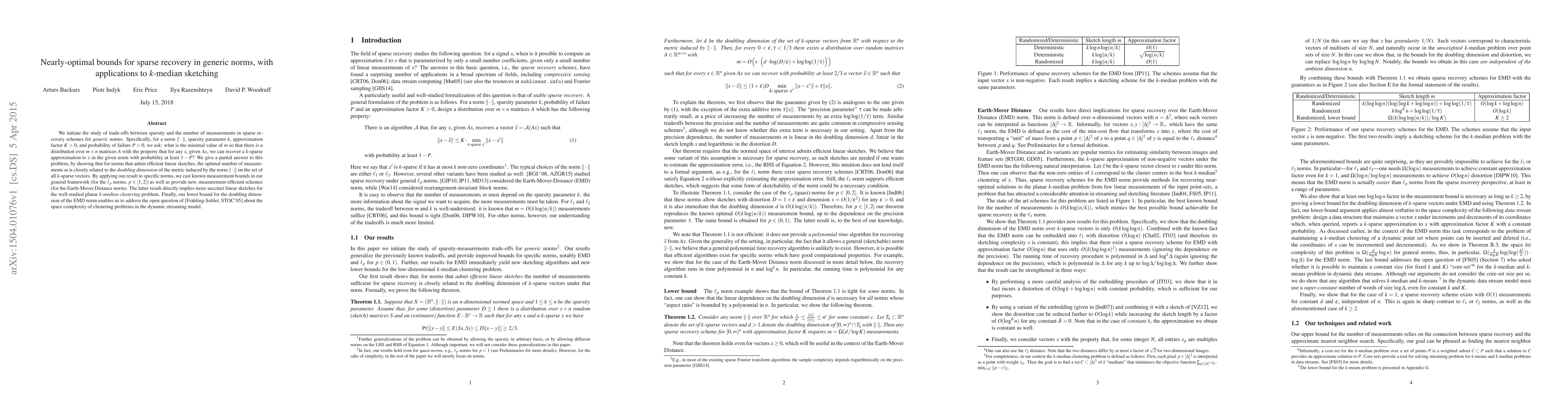 This paper investigates the trade-offs between sparsity and measurement count in sparse recovery schemes for generic norms, providing nearly-optimal bounds for the minimal number of measurements required. It applies these findings to develop efficient linear sketches for the $k$-median clustering problem, addressing the open question of space complexity in dynamic streaming clustering.