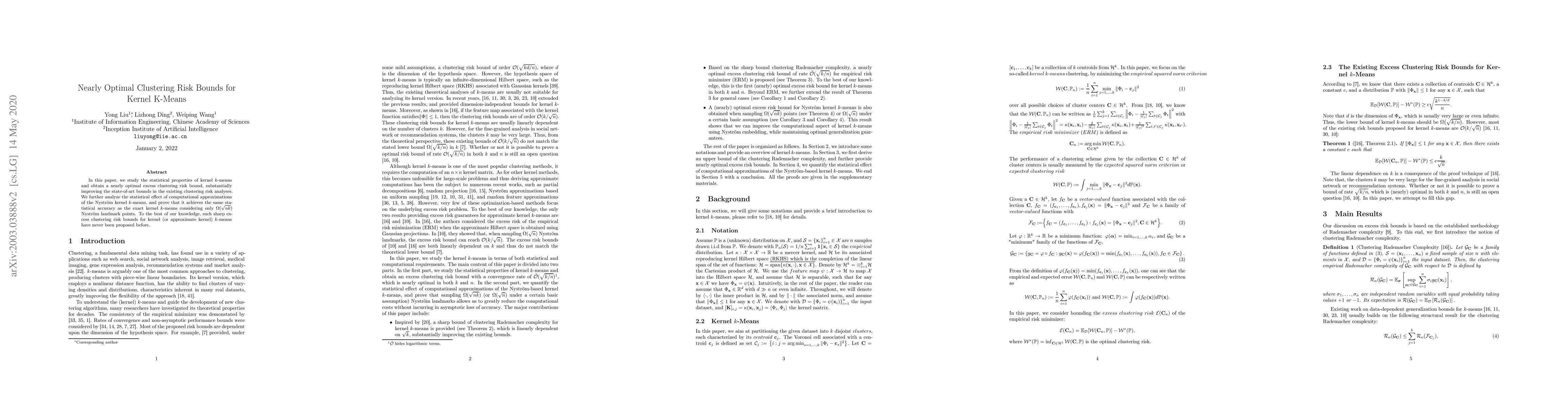 This paper presents nearly optimal clustering risk bounds for kernel $k$-means, significantly improving existing analyses. It also demonstrates that computational approximations using the Nyström method maintain statistical accuracy with only $\Omega(\sqrt{nk})$ landmark points.