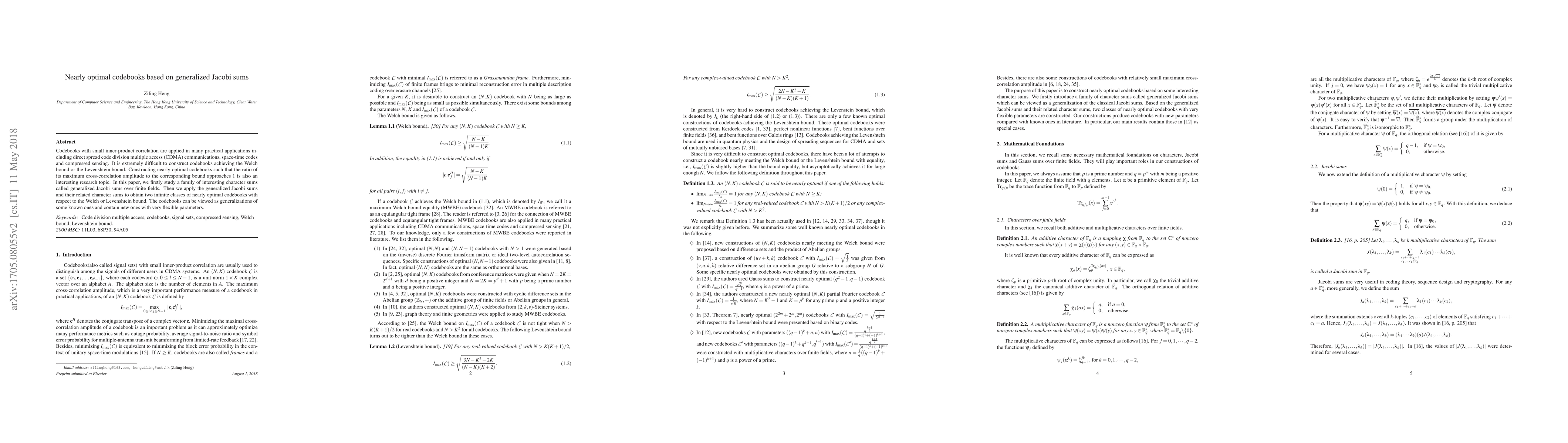 Codebooks with small inner-product correlation are applied in many practical applications including direct spread code division multiple access (CDMA) communications, space-time codes and compressed sensing. It is extremely difficult to construct codebooks achieving the Welch bound or the Levenshtein bound. Constructing nearly optimal codebooks such that the ratio of its maximum cross-correlation amplitude to the corresponding bound approaches 1 is also an interesting research topic. In this paper, we firstly study a family of interesting character sums called generalized Jacobi sums over finite fields. Then we apply the generalized Jacobi sums and their related character sums to obtain two infinite classes of nearly optimal codebooks with respect to the Welch or Levenshtein bound. The codebooks can be viewed as generalizations of some known ones and contain new ones with very flexible parameters.