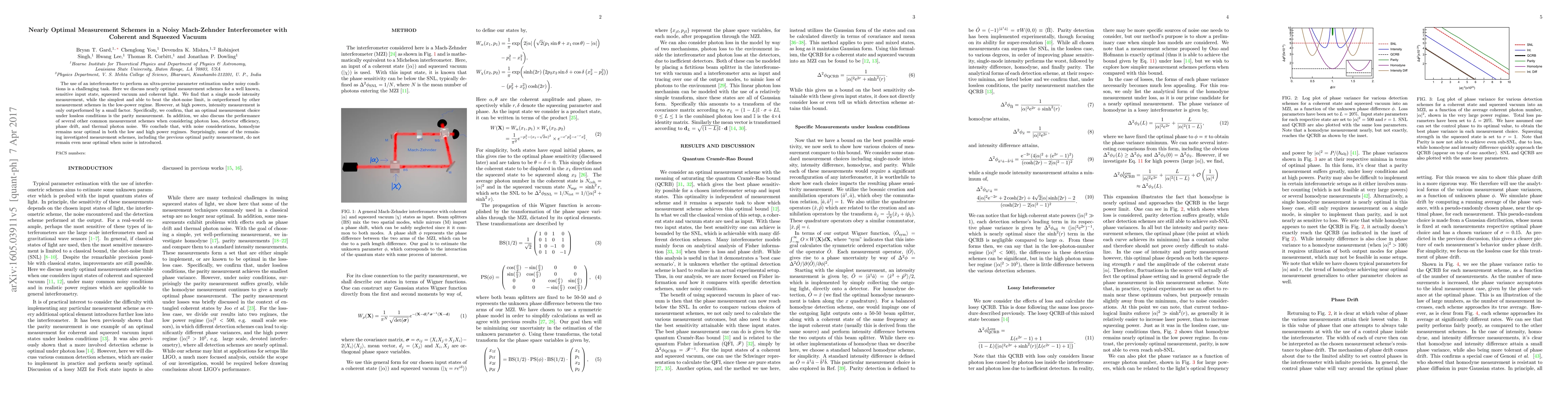 The use of an interferometer to perform an ultra-precise parameter estimation under noisy conditions is a challenging task. Here we discuss nearly optimal measurement schemes for a well known,sensitive input state, squeezed vacuum and coherent light. We find that a single mode intensity measurement, while the simplest and able to beat the shot-noise limit, is outperformed by other measurement schemes in the low-power regime. However, at high powers, intensity measurement is only outperformed by a small factor. Specifically, we confirm, that an optimal measurement choice under lossless conditions is the parity measurement. In addition, we also discuss the performance of several other common measurement schemes when considering photon loss, detector efficiency, phase drift, and thermal photon noise. We conclude that, with noise considerations, homodyne remains near optimal in both the low and high power regimes. Surprisingly, some of the remaining investigated measurement schemes, including the previous optimal parity measurement, do not remain even near optimal when noise is introduced.