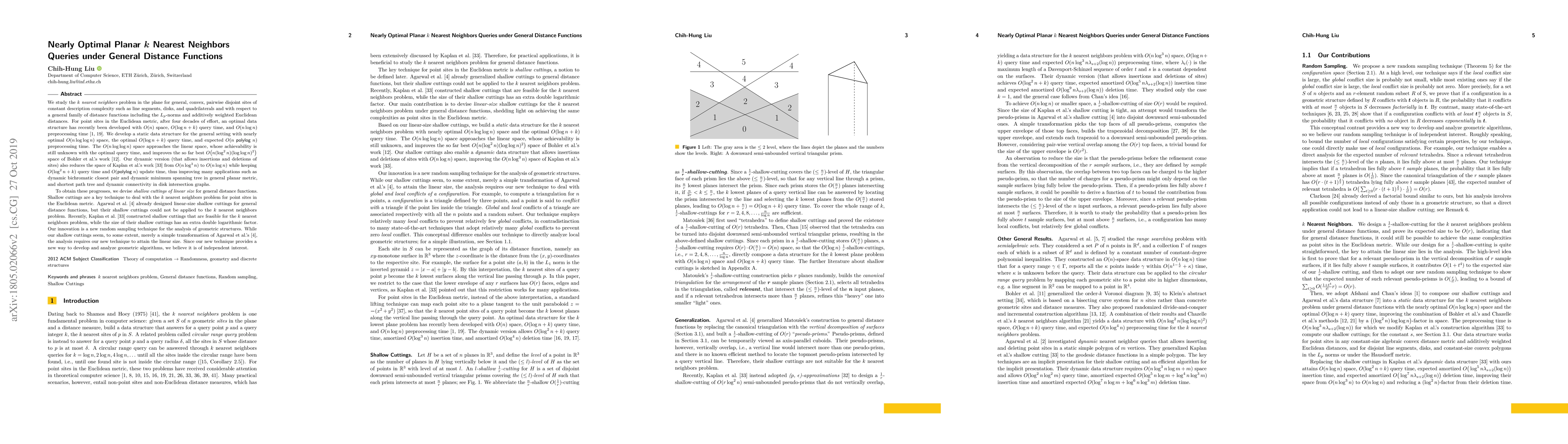 This paper presents a nearly optimal static data structure for the k nearest neighbors problem in planar spaces with general distance functions, achieving O(n log log n) space, O(log n + k) query time, and O(n polylog n) preprocessing time. It also introduces a dynamic version that reduces space complexity and leverages a new random sampling technique for geometric structures.