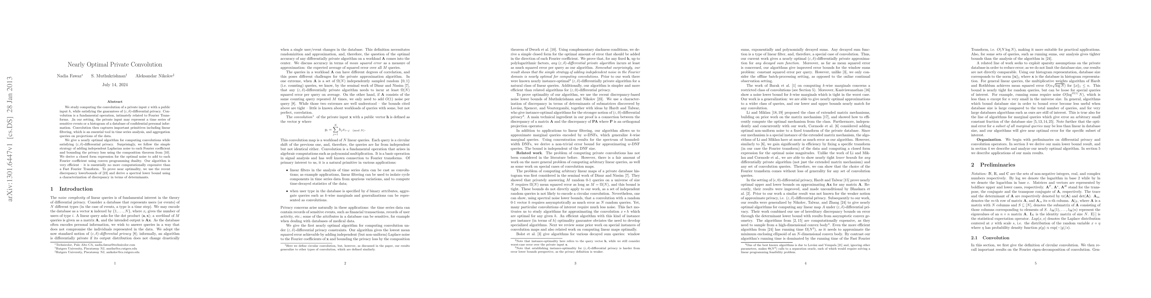 This paper presents a nearly optimal algorithm for computing convolutions under $(\epsilon, \delta)$-differential privacy, employing Laplacian noise on Fourier coefficients. The method is efficient, comparable to a Fast Fourier Transform, and leverages convex programming for optimal noise determination.