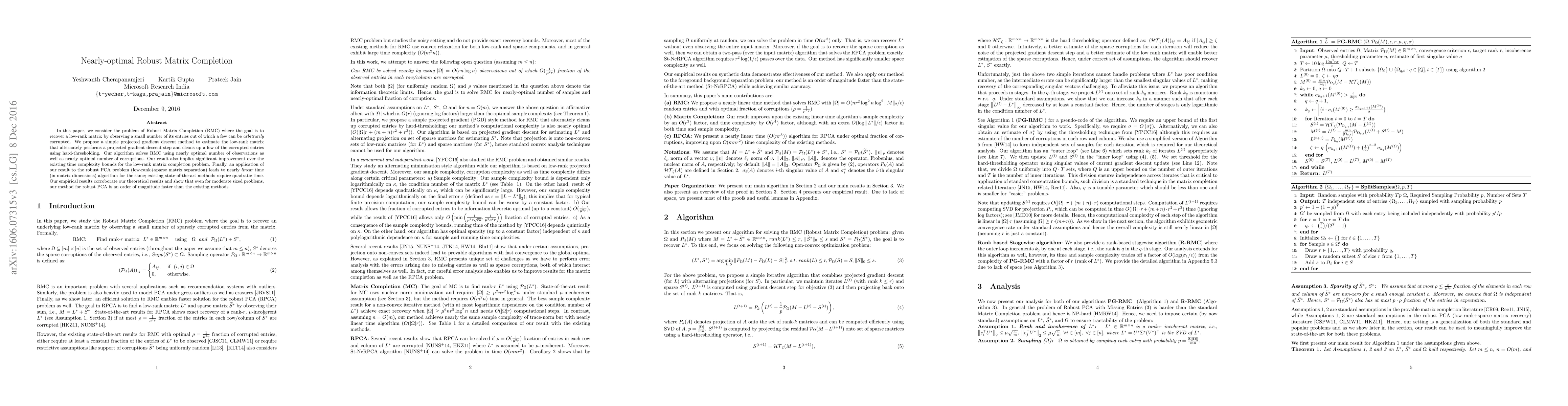 This paper proposes a projected gradient descent method for Robust Matrix Completion, achieving nearly optimal recovery with fewer observations and corruptions. The method also significantly improves time complexity for low-rank matrix completion, leading to a nearly linear time algorithm for robust PCA, outperforming existing quadratic time methods.