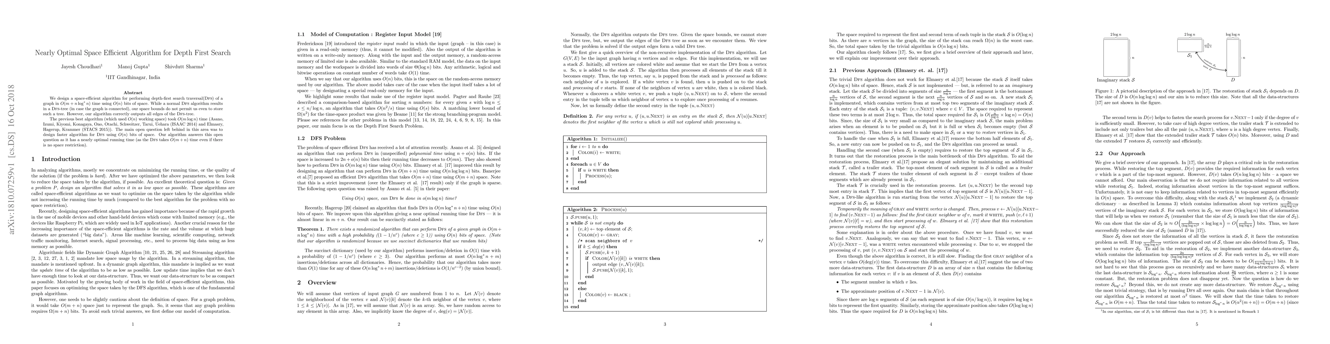 This research paper presents an algorithm for depth-first search that uses $O(n)$ bits of space, achieving nearly optimal time complexity of $O(m+n"log^* n)$, solving the open question in this area.