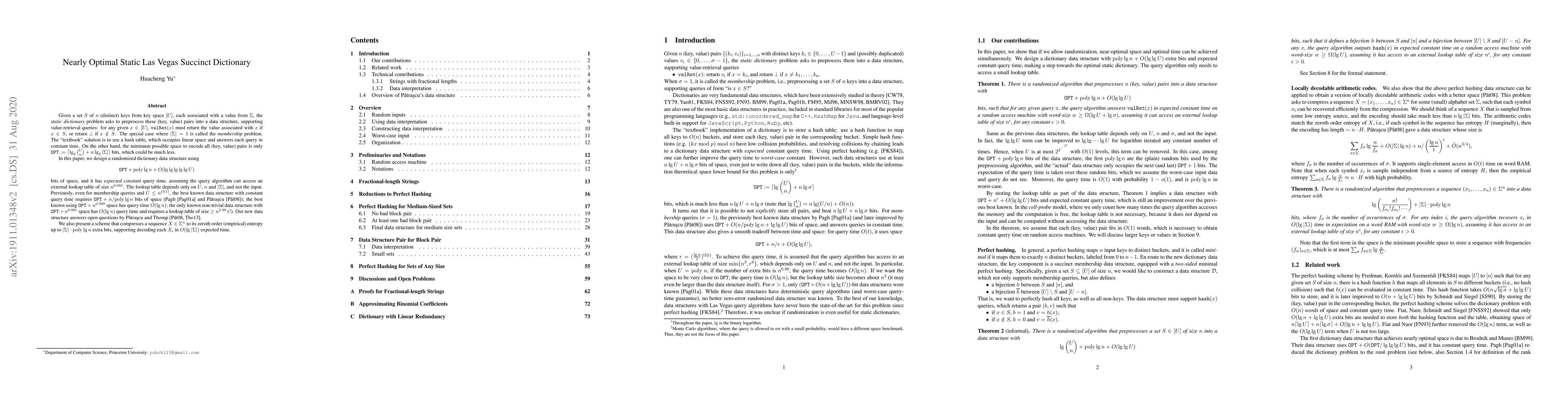 Given a set $S$ of $n$ (distinct) keys from key space $[U]$, each associated with a value from $\Sigma$, the \emph{static dictionary} problem asks to preprocess these (key, value) pairs into a data structure, supporting value-retrieval queries: for any given $x\in [U]$, $\mathtt{valRet}(x)$ must return the value associated with $x$ if $x\in S$, or return $\bot$ if $x\notin S$. The special case where $|\Sigma|=1$ is called the \emph{membership} problem. The "textbook" solution is to use a hash table, which occupies linear space and answers each query in constant time. On the other hand, the minimum possible space to encode all (key, value) pairs is only $\mathtt{OPT}:= \lceil\lg_2\binom{U}{n}+n\lg_2|\Sigma|\rceil$ bits, which could be much less. In this paper, we design a randomized dictionary data structure using $\mathtt{OPT}+\mathrm{poly}\lg n+O(\lg\lg\lg\lg\lg U)$ bits of space, and it has \emph{expected constant} query time, assuming the query algorithm can access an external lookup table of size $n^{0.001}$. The lookup table depends only on $U$, $n$ and $|\Sigma|$, and not the input. Previously, even for membership queries and $U\leq n^{O(1)}$, the best known data structure with constant query time requires $\mathtt{OPT}+n/\mathrm{poly}\lg n$ bits of space (Pagh [Pag01] and P\v{a}tra\c{s}cu [Pat08]); the best-known using $\mathtt{OPT}+n^{0.999}$ space has query time $O(\lg n)$; the only known non-trivial data structure with $\mathtt{OPT}+n^{0.001}$ space has $O(\lg n)$ query time and requires a lookup table of size $\geq n^{2.99}$ (!). Our new data structure answers open questions by P\v{a}tra\c{s}cu and Thorup [Pat08,Tho13]. We also present a scheme that compresses a sequence $X\in\Sigma^n$ to its zeroth order (empirical) entropy up to $|\Sigma|\cdot\mathrm{poly}\lg n$ extra bits, supporting decoding each $X_i$ in $O(\lg |\Sigma|)$ expected time.