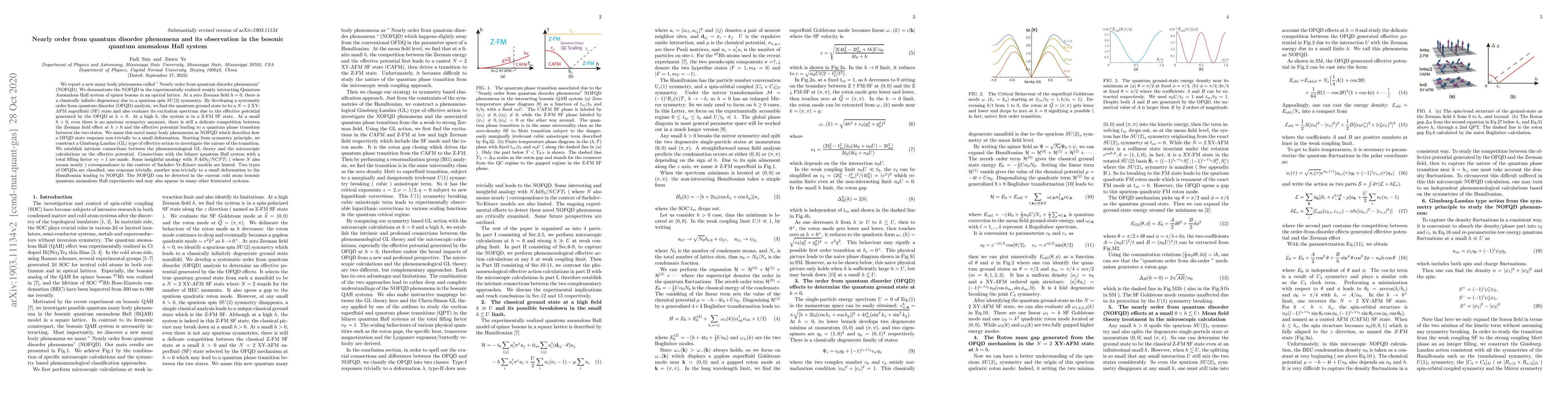 This paper introduces a new many-body phenomenon termed "Nearly order from quantum disorder phenomena" (NOFQD) observed in a bosonic quantum anomalous Hall system. It connects this phenomenon with theoretical models and suggests its potential detection in cold atom experiments and other frustrated systems.