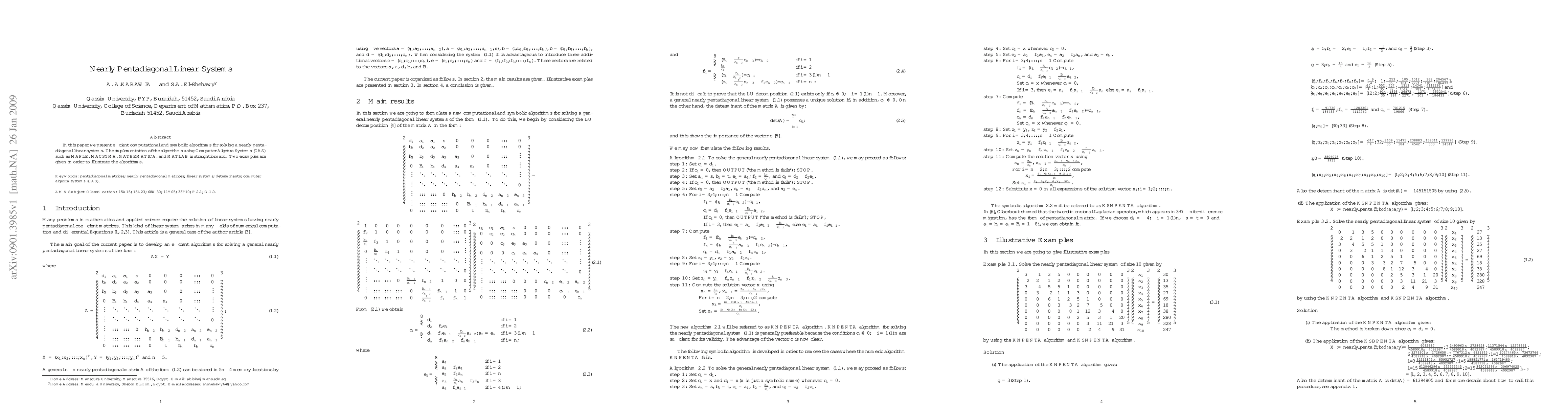 This paper introduces efficient algorithms for solving nearly pentadiagonal linear systems, emphasizing straightforward implementation in CAS like MAPLE, MACSYMA, MATHEMATICA, and MATLAB. Two examples demonstrate the practical application of these algorithms.