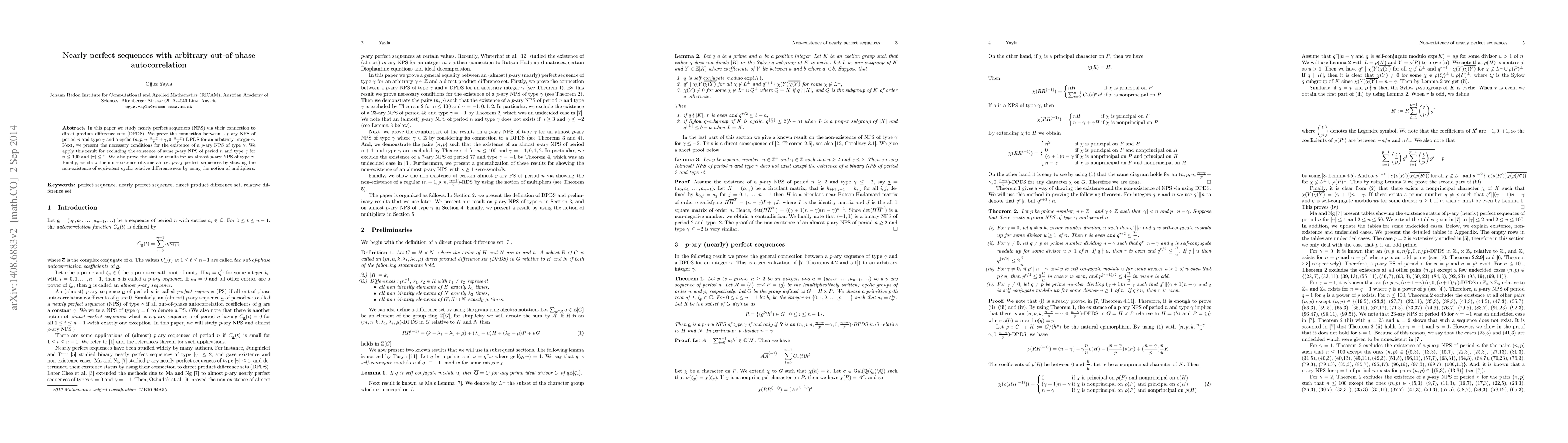 In this paper we study nearly perfect sequences (NPS) via their connection to direct product difference sets (DPDS). We prove the connection between a $p$-ary NPS of period $n$ and type $\gamma$ and a cyclic $(n,p,n,\frac{n-\gamma}{p}+\gamma,0,\frac{n-\gamma}{p})$-DPDS for an arbitrary integer $\gamma$. Next, we present the necessary conditions for the existence of a $p$-ary NPS of type $\gamma$. We apply this result for excluding the existence of some $p$-ary NPS of period $n$ and type $\gamma$ for $n \leq 100$ and $\vert \gamma \vert \leq 2$. We also prove the similar results for an almost $p$-ary NPS of type $\gamma$. Finally, we show the non-existence of some almost $p$-ary perfect sequences by showing the non-existence of equivalent cyclic relative difference sets by using the notion of multipliers.