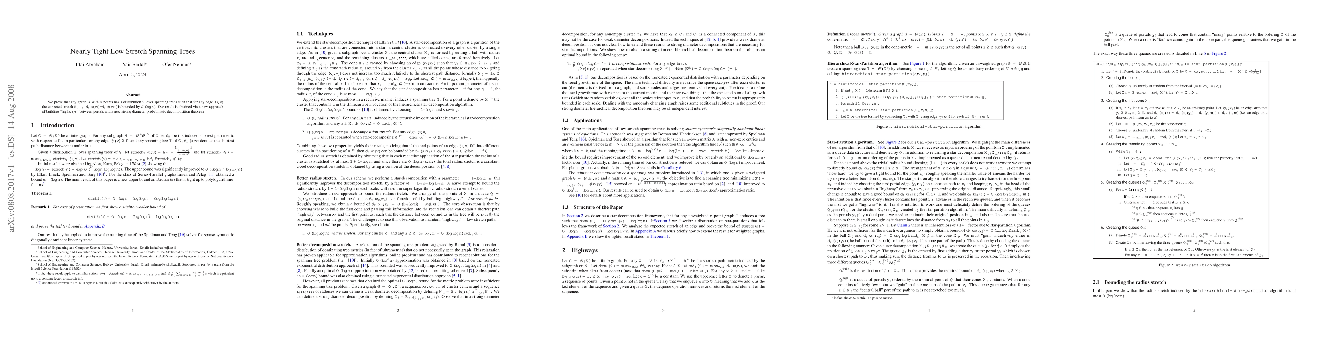 The paper presents a new probabilistic decomposition theorem and a hierarchical star partitioning algorithm to construct low-stretch spanning trees with expected stretch O(log n).