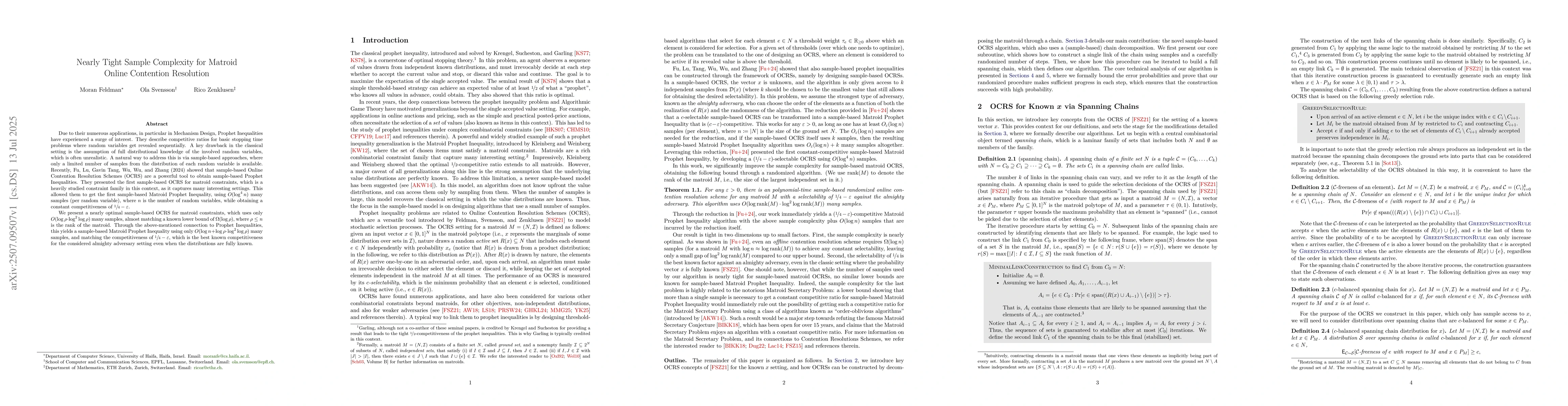 Due to their numerous applications, in particular in Mechanism Design, Prophet Inequalities have experienced a surge of interest. They describe competitive ratios for basic stopping time problems where random variables get revealed sequentially. A key drawback in the classical setting is the assumption of full distributional knowledge of the involved random variables, which is often unrealistic. A natural way to address this is via sample-based approaches, where only a limited number of samples from the distribution of each random variable is available. Recently, Fu, Lu, Gavin Tang, Wu, Wu, and Zhang (2024) showed that sample-based Online Contention Resolution Schemes (OCRS) are a powerful tool to obtain sample-based Prophet Inequalities. They presented the first sample-based OCRS for matroid constraints, which is a heavily studied constraint family in this context, as it captures many interesting settings. This allowed them to get the first sample-based Matroid Prophet Inequality, using $O(\log^4 n)$ many samples (per random variable), where $n$ is the number of random variables, while obtaining a constant competitiveness of $\frac{1}{4}-\varepsilon$. We present a nearly optimal sample-based OCRS for matroid constraints, which uses only $O(\log \rho \cdot \log^2\log\rho)$ many samples, almost matching a known lower bound of $\Omega(\log \rho)$, where $\rho \leq n$ is the rank of the matroid. Through the above-mentioned connection to Prophet Inequalities, this yields a sample-based Matroid Prophet Inequality using only $O(\log n + \log\rho \cdot \log^2\log\rho)$ many samples, and matching the competitiveness of $\frac{1}{4}-\varepsilon$, which is the best known competitiveness for the considered almighty adversary setting even when the distributions are fully known.