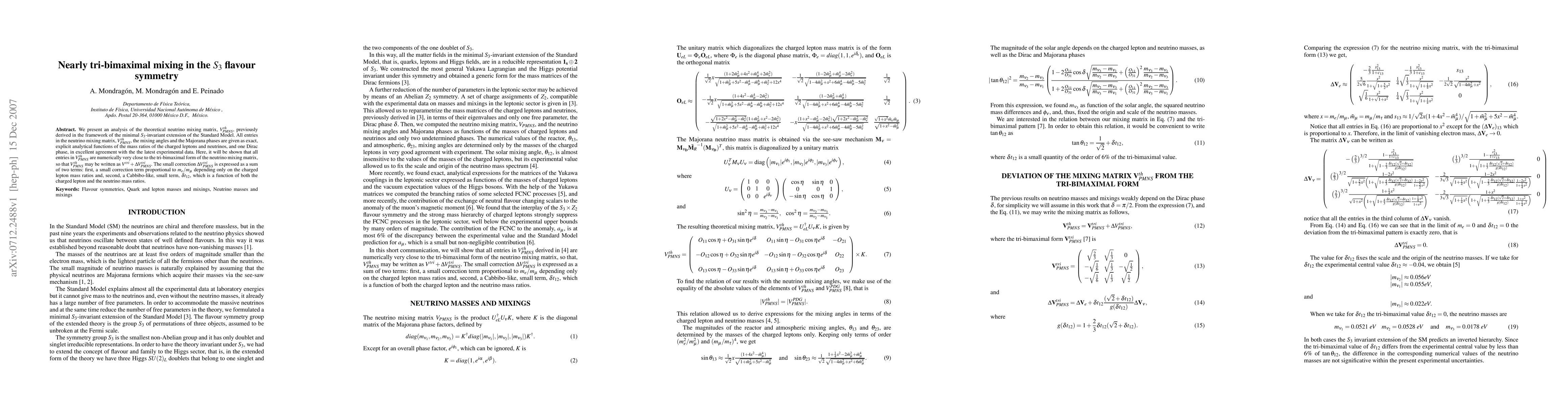 This paper analyzes the theoretical neutrino mixing matrix derived from an S_3-invariant extension of the Standard Model, showing it nearly matches the tri-bimaximal form with small corrections dependent on charged lepton and neutrino mass ratios. The results align closely with experimental data.