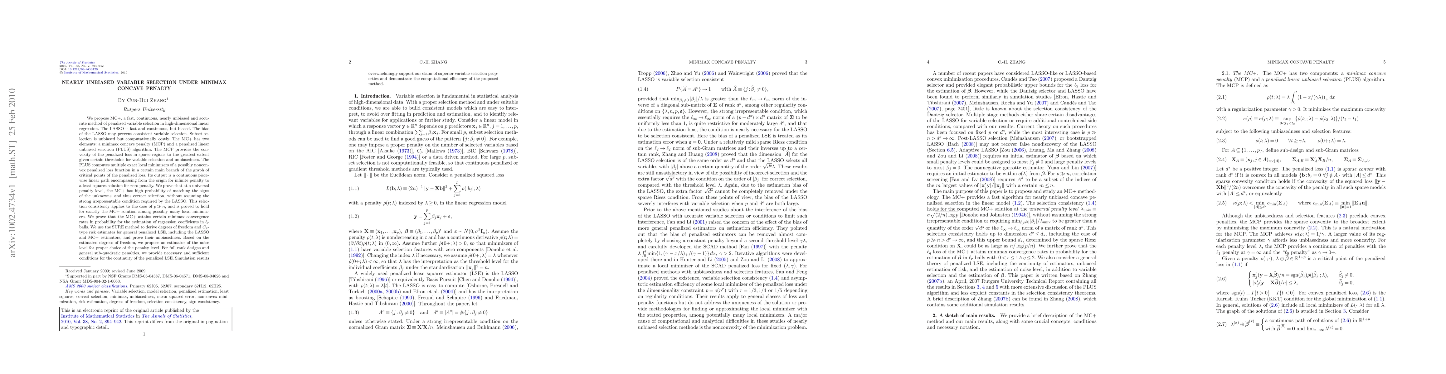 The paper introduces MC+ for nearly unbiased variable selection in high-dimensional linear regression, combining a minimax concave penalty and a penalized linear unbiased selection algorithm to achieve consistent selection without the strong irrepresentable condition. It demonstrates minimax convergence rates and unbiasedness, proposing a method for selecting the penalty level based on estimated degrees of freedom.